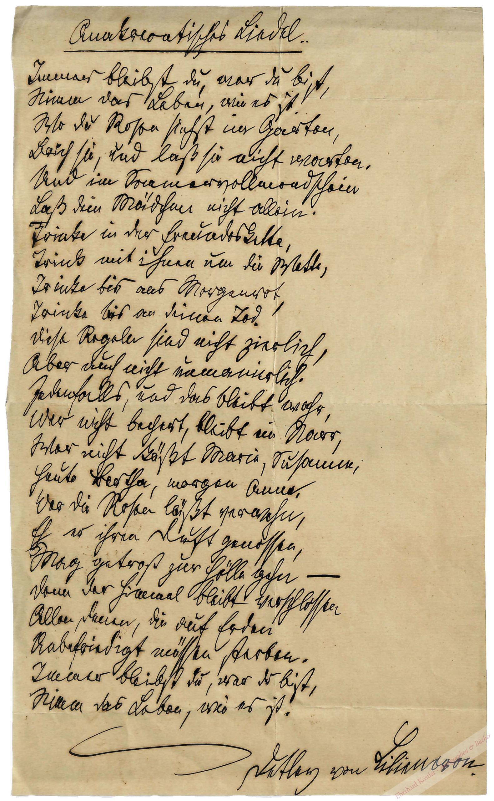 „Anakreontisches Liedel. || Immer bleibst du, wer du bist; | Nimm das Leben, wie es ist. | Wo du Rosen siehst im Garten, | Brich sie, und laß sie nicht warten. | Und im Sommervollmondschein | Laß dein Mädchen nicht allein. | Trinke in der Freundeskette, | Trink mit ihnen um die Wette, | Trinke bis ans Morgenrot, | Trinke bis an deinen Tod […]“ – Liliencron schrieb dieses Gedicht zum 50. Geburtstag von Peter Altenberg und schickte es an Karl Kraus, der es in seiner „Fackel“ am 31. März 1909 erstmals veröffentlichte. „Unter Ausnutzung einer Lücke im Urheberrecht […] wird das Gedicht vielfach nachgedruckt.“ Nach einem Rechtsstreit muss Liliencron allerdings nachhonoriert werden. Vgl. die Dokumentation dieses Falls durch den Briefwechsel Liliencron-Kraus in: J. Kersten, F. Pfäfflin (Hrsg), Detlev von Liliencron, entdeckt, gefeiert und gelesen von Karl Kraus. Göttingen 2016, S. 289-306. V. Griese, Liliencron-Chronik. Münster 2009, S. 258 ff.