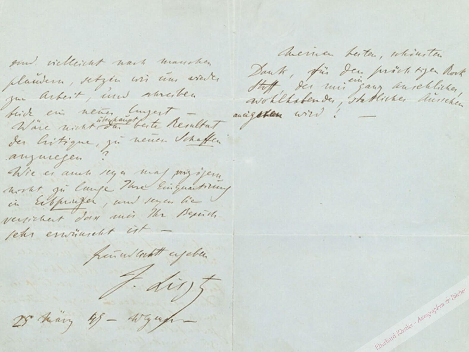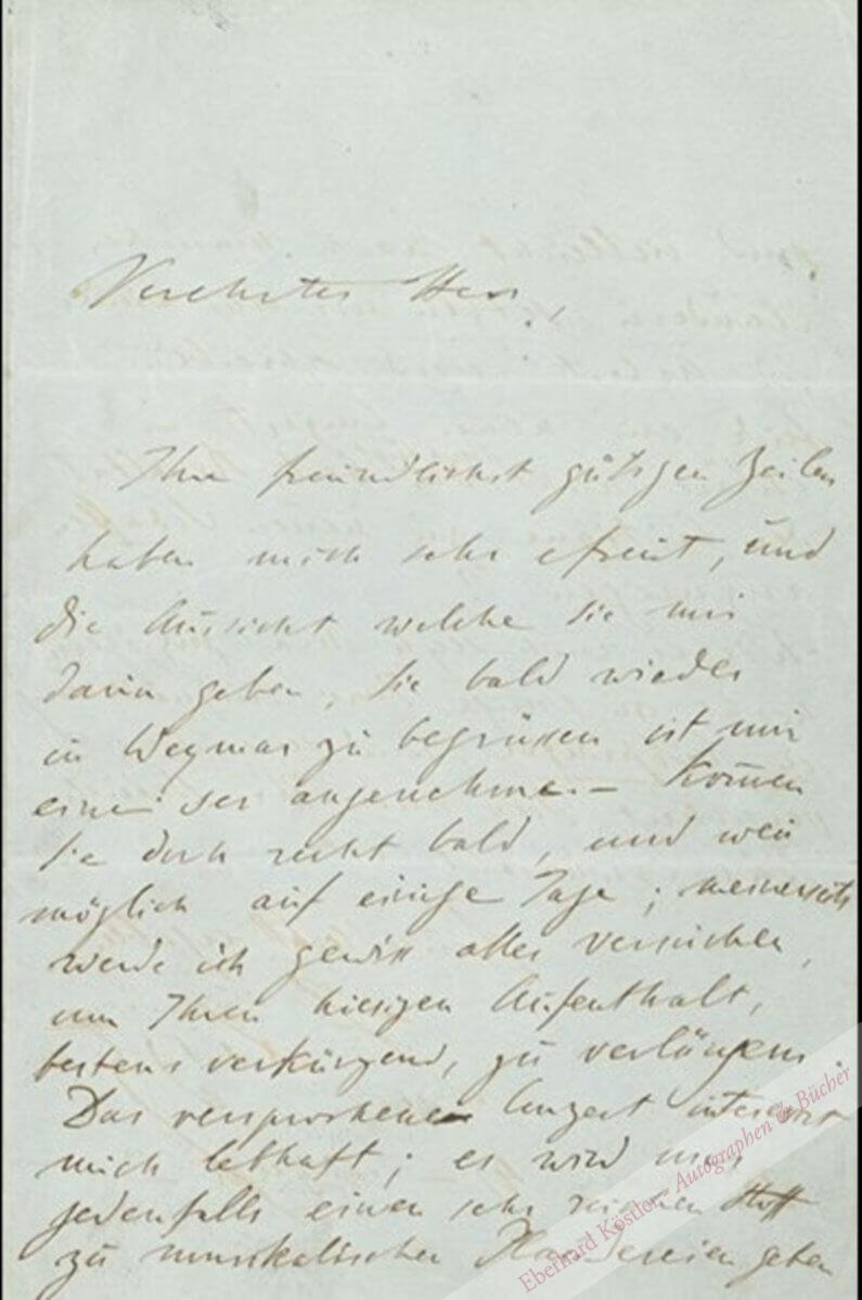In deutscher Sprache an den Komponisten Carl Reinecke (1824-1910) in Leipzig: „[…] Ihre freundlichst gütigen Zeilen haben mich sehr erfreut, und die Aussicht welche Sie mir darin geben, Sie bald wieder in Weymar zu begrüßen ist mir eine se[h]r angenehme. – Kommen Sie doch recht bald, und wenn möglich auf einige Tage; meinerseits werde ich gewiss alles versuchen, um Ihren hiesigen Aufenthalt, bestens verkürzend, zu verlängern. Das versprochene Conzert interessirt mich lebhaft; es wird uns jedenfalls einen sehr reichen Stoff zu musikalischen Plaudereien geben, und vielleicht nach manchem Plaudern setzen wir uns wieder zur Arbeit, und schreiben beide ein neues Conzert. – Wäre nicht überhaupt das beste Resultat der Critique, zu neuem Schaffen anzuregen? Wie es auch seyn mag, verzögern [Sie] nicht zu lange Ihre Einquartirung im Erbprinzen, uns seyen Sie versichert dass mir Ihr Besuch sehr erwünscht ist […] Meinen besten, schönsten Dank, für den prächtigen Rock Stoff, der mir ein ganz ansehnliches, wohlhabendes, stattliches Aussehen aneignen wird! – “ – Der Geiger Heinrich Wilhelm Ernst hatte seinen Freund Reinecke veranlaßt, 1849 mit ihm nach Weimar zu reisen, um Franz Liszt zu besuchen. Dieser Besuch veränderte Reineckes Leben grundlegend: im Herbst 1849 erhielt Reinecke auf Anregung von Franz Liszt eine Einladung von Hector Berlioz nach Paris, wo er als Pianist auftrat und Ferdinand Hiller wiedersah, der ihm 1851 eine Dozentur für Klavier am Kölner Konservatorium verschaffte. Dort lernte er auch Schumann und Brahms kennen. – Kleiner Einriss in der Falte, am oberen Rand von S. 3 kleine alt hinterlegte Fehlstelle ohne Textverlust. – Druck: Briefe, hrsg. von La Mara, Bd. I (1893), S. 73 f., Nr. 56.