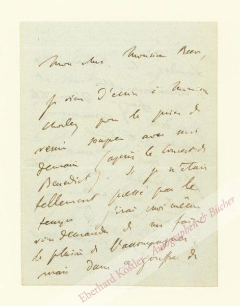 An den Publizisten Henry Reeve (1813-1895) mit einer Einladung und mit der Entschuldigung dafür, dass er sie nicht persönlich überbringe: „[…] Je viens d’ecrire à Monsieur Morley pour le prier de venir souper avec moi demain (après le Concert de Benedict). Si je n’etais tellement pressé par le temps, j’irai moi même vous demander de me faire le plaisir de laccompagner; mais dans ce gouffre de Londres, les distances sont si incommensurables …. et je suis chargé d’un telle quantité de commissions, affaires, etc. etc. Soyez donc assez aimable pour accepter mon invitation ecrite, telle quelle, afin que nous ayons au moins le loisir de nous dire adieu et à Revoir avant mon depart de Londres. Veuillez bien agreer […] l’expression des mes sentiments les plus distinguées et les plus affectueusement devouées […] Le rendez vous est […] chez Very, Regent Street.“ – Reeve war Augenzeuge von Liszts Zusammenbruch im April 1835 auf der Pariser Konzertbühne und hat einem bewegenden Bericht davon überliefert (vgl. Walker, Bd. I, 204). Am 9. und 19. Juni 1840 gab Liszt zwei Konzerte in London, wie Reeve in seinem Kalender festhielt. – Auf der vierten Seite eigenh. Schenkungsvermerk mit Unterschrift seines Schülers, des schottischen Pianisten Frederic Lamond sowie Bleistiftzeilen des Beschenkten von 1946.