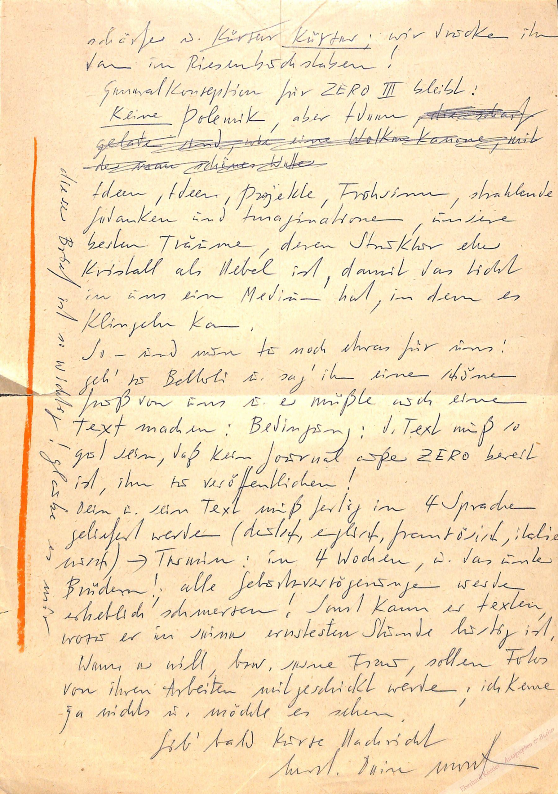 An den Kunsthändler Carl Laszlo (1923-2013). – I. „bitte nicht böse sein, daß ich nie von mir hab‘ hören lassen; ich bin immer kaputt, vor lauter Arbeit und Tra-ri-Tra-tra […] Im Augenblick sind wir häuslich an ZERO III erkrankt; das Unternehmen ist jetzt eindeutig gezeugt worden und die gesegnete Geburt wird nicht ausbleiben […] Am besten, Du schreibst, daß die Welt besser werden muß: da das wirklich wünschenswert ist […] Oder schreib‘, worüber Du willst. – Deinen Text über: ‚Was heißt Avantgarde heute‘ habe ich natürlich noch […] Generalkonzeption für ZERO III bleibt: Keine Polemik, aber Ideen […] Ideen, Ideen, Projekte, Frohsinn, strahlende Gedanken und Imaginationen, unsere besten Träume, deren Struktur eher Kristall als Nebel ist, damit das Licht in uns ein Medium hat, in dem es klingeln kann [… am Rand:] ZERO kostet uns ein Vermögen! Wir bitten, das zu respektieren: 500% Mitarbeit | dieser Brief ist so wichtig! glaube es mir“. – Papierbedingt etw. gebräunt. – II. Wegen seines Beitrags für das Sammelwerk „La Lune en Rodage“. Obere Briefhälfte mit größerem Ausschnitt und rückseitigem Textverlust. – III. „immer noch auf mich böse?“ – Heinz Mack ist Mitbegründer der international einflussreichen ZERO Gruppe. – Sehr selten.
