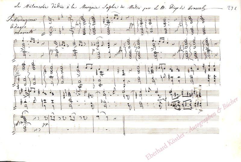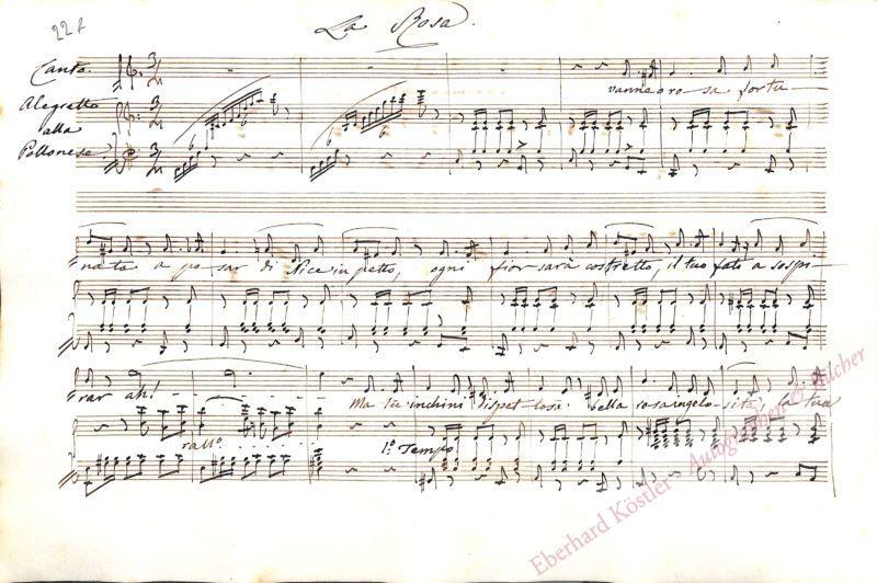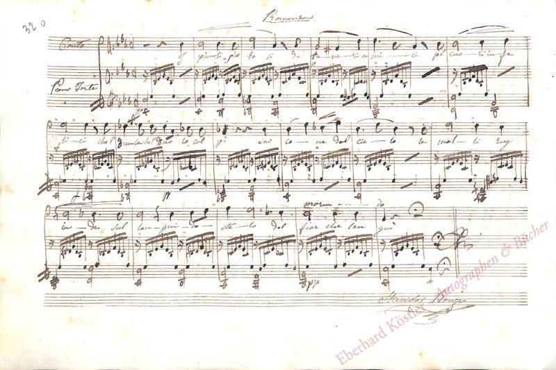 Sehr schöne musikalische Albumblätter mit abgeschlossenen kleinen Kompositionen aus dem Album von Sofia de’Medici, Marchesa di Marignano (1811-?). Die Marquesa führte in Mailand einen seinerzeit berühmten musikalischen Salon, in dem auch Verdi, Donizetti und Hiller verkehrten. Verdi etwa steuerte zu ihrem Album am 6. Mai 1842 sein Lied „Chi i bei dì mi adduce ancora“ (nach Goethe) bei (Autograph verschollen). Donizetti trug sich 1841 oder 1842 mit einer Romanze ohne Titel ein, deren Text mit den Worten „Io amo mestizia“ beginnt. Franco Schlitzer hat Donizettis Albumblatt und das ganze Album 1954 beschrieben (in: Derselbe, Mondo teatrale dell’ottocento. Neapel 1954. S. 54-57). – Unsere Blätter enthalten folgende Kompositionen: I. Diego de Araciel, Komponist und Musikdirektor in Mailand (1786-1866). „La Mélancholie“ für Piano. 3 Seiten (29 bis 31). „dédiée à la Marquise Sophie de Medici“. II. Pietro Antonio Coppola, Komponist (1793-1876). Liedkomposition „Rapido nell’estagi d’un caro dolore“. 3 Seiten (17, 20 und 21). III. Durand (Duranowski), Auguste-Frédéric, Violinvirtuose (1770-nach 1834). „La Mélancholie = Fantaisie“ für Violine und Piano. 2 Seiten (60 und 61). „à Mademoiselle la Marquise Sophie de Medici de Marignano, 15. XI. 1838“. IV. Henry Louis Stanislas Mortier de Fontaine, Pianist und Komponist (1816-1883). „Galop“ für Piano. 1 1/2 Seiten (25 und 26). „dédié à Mademoiselle Sophie Medici, Marquise de Marignano“. V. Alessandro Nini, Komponist (1805-1880). „Romanza La Serenata del Pastore“ für Gesang und Piano. 5 Seiten (62-66). „L’occhio nero, il bel cui […]“ – „Cette petite composition fut ecrite pour Mademoiselle Sophie Marquise de Medici, chez elle au plus grand bruit d’une conversation anglaise par A. Nini le 19. Decembre 1838.“ VI. Michele Rachelle, Violinist und Musikdirektor in Mailand (178?-186?). „La Rosa“ für Gesang und Piano: „Vanne o rosa fortunata a posar di Nice in petto“. 3 Seiten (22-24). VII. Regny, A., Komponist. „Valse“. 2 Seiten (18 und 19). VIII. Antonio Ronzi, Sänger (1813-1873). „All[egre]tto“ für Piano. 2 Seiten (33 bis 34). IX. Stanislao Ronzi, Sänger (1823-1893). „Romanza“ für Gesang und Piano. 1 Seite (32). Sehr guter Einblick in das Mailänder Musikleben der höheren Stände im Mailand der 1830er Jahre. – Gut erhalten.