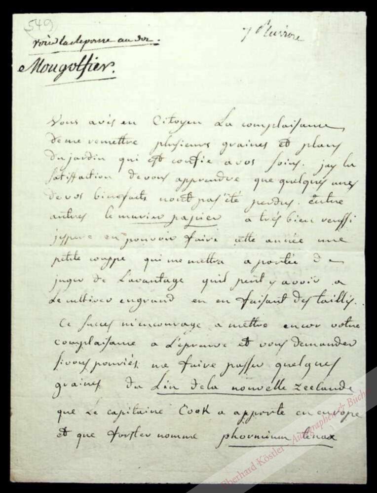 An den Botaniker André Thouin (1747-1824) „au Museum national d’histoire Naturelle […] a Paris“: „Vous avés eu Citoyen la complaisance, de me remettre plusieurs graines et plan[t]s du jardin qui est confié a vos soins. J’ay la satisfaction de vous apprendre que quelques uns de vos bienfaits n’ont pas été perdus. Entre autres le murier papier a très bien reussi. J’espere en pouvoir faire cette année une petite couppe qui me mettra a portée de juger de l’avantage qu’il peut y avoir a le cultiver en grand en en faisant des taillis. Ce succes m’encourage a mettre encore votre complaisance a l’epreuve et vous demander si vous pouviez me faire passer quelques graines du Lin de la nouvelle Zeelande que le capitaine Cook a apporté en Europe et que Forster nomme phormium tenax. Je voudrois tenter la culture de cette plante dans nos montagnes dont il paroit que le sol pouroit convenir suivant ce que rapporte le navigateur a qui nous devons cette production. Si vous pouviez joindre aux graines de cette plante utile quelques graines de la fleur nommée gaillarde je vous serois obligé de m’en faire envoy d’un petit pacquet par la poste. Si vous voyez notre ami comun Louis je vous prie me rappeler a son souvenir ainsi qua celuy de vos collegues Bernardin de St. Pierre et Faujas. Recevez les assurances de mon sincere attachement et de ma reconoissance. Salut et fraternité […]“ – Auf Seite 3 die Antwort: 21 Pluvôse an III (9. II. 1795): „C[itoy]en | en l’absence de mon frère en mission avec le C[itoye]n Faujas par ordre du Gouvernement depuis le 19 fructidor d[erni]er j’ai pris d’après son désir communication de la lettre que vous lui avez adressée le 7. de ce mois. C’est avec regret que je me vois forcé de vous annoncer qu’il n’existe pas dans cet établissement la plante désignée sous le nom phormium tenax, dite lin de la nouvelle Zeelande ainsi que celle denommée Gaillarde. Vous ne devez pas douter C[itoy]en de la satisfaction que j’aurois eue à vous procurer des graines de ces végétaux; l’usage que vous en auriez fait tendant à l’amélioration de lagriculture, et par conséquent au bien de tous. S. F. [Salut et fraternité) J. Th. [Jacques Thouin].“ – Montgolfier interessierte sich ausser für Ballonfahrt auch für die Einbürgerung ausländischer Nutzpflanzen, wie den hier im Brief erwähnten Papiermaulbeerbaum und den Neuseelandflachs. – Jacques Thouin (1751-1836) verwaltete zusammen mit seinem Bruder André den „Jardin des Plantes“ des Pariser Naturgeschichtlichen Museums. – Von allergrößter Seltenheit.