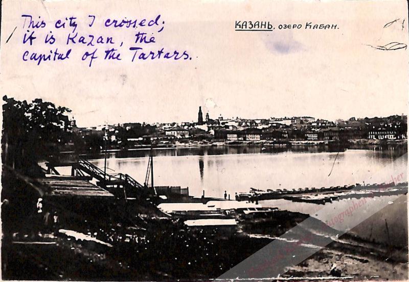 In Englisch an Thomas A. Graham in Denver, Cororado: „My dear friend, I made a beautiful trip over five big rivers of Russia on a boat in 8 days. During this trip I could contemplate as well as concentrate. My health is much better, almost excellent. Love and greetings and all best wishes from Serge Prokoffieff.“ Auf der Bildseite der eigenh. Text: „This city I crosses; it is Kazan, the capital of the Tartars.“ – Bildseite: Gesamtansicht von Kazan. – Die Unterlängen der Unterschrift sind über das Blatt hinausgeschrieben worden. – Schriftseite mit gelöster Verklebung, teilw. mit leichtem Buchstabenverlust. – Sehr selten.