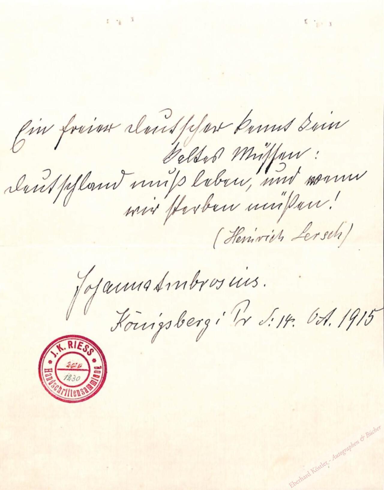 „Ein freier Deutscher kennt kein kaltes Müssen: Deutschland muss leben, und wenn wir sterben müssen! (Heinrich Lersch)“ – Mit rotem Sammlungsstempel.