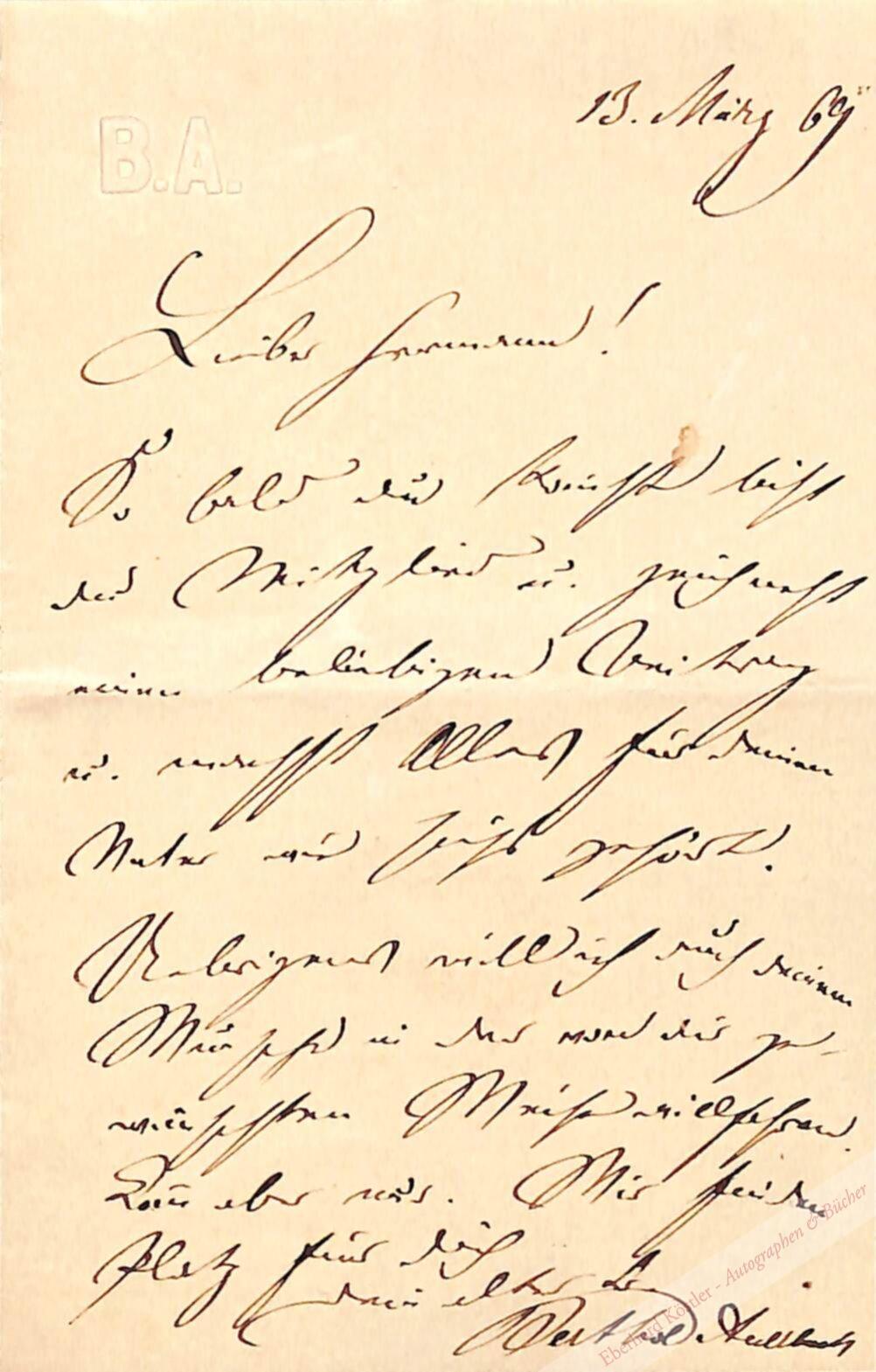 „Lieber Freund! So bald Du kommst bist Du Mitglied und zeichnest einen beliebigen Beitrag und machst Alles für deinen Vater wie sichs gehört. Übrigens will ich auch Deinem Wunsche in der von Dir gewünschten Weise willfahren. Komm aber nur. Wir finden Platz für Dich […]“ – Beiliegend ein Umschlag.
