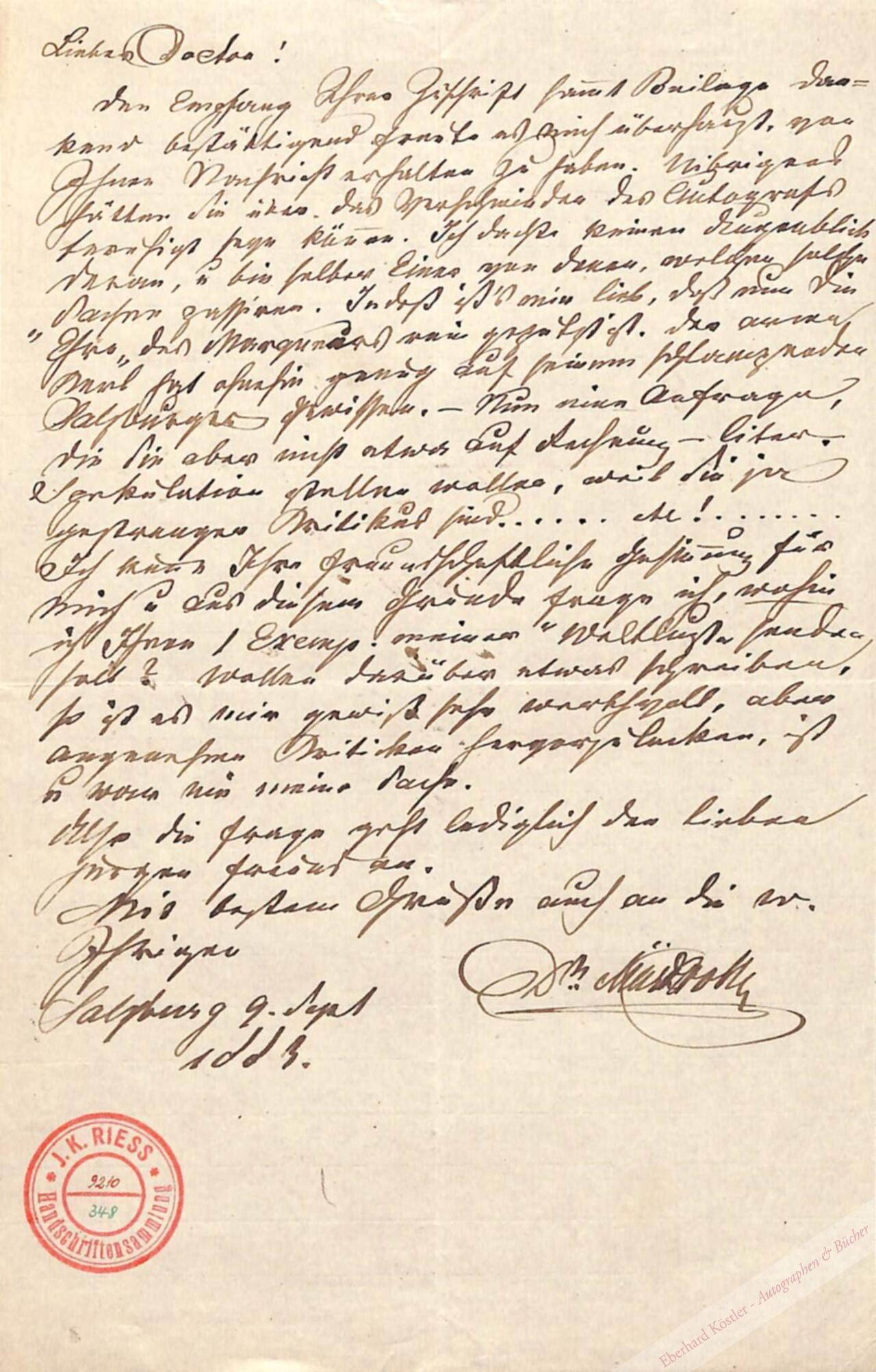 I: „Lieber Doctor! Den Empfang Ihrer Zuschrift samt Beilage dankend bestätigend freute es mich überhaupt, von Ihnen Nachricht erhalten zu haben. Übrigens hätten Sie über das Verschwinden des beruhigt seyn können. Ich dachte keinen Augenblick daran, u. bin selber einer von denen, welchen solche Sachen passieren […].“ II: „Liebster junger Freund! Eine schmerzfreie Stunde erhaschend, eile ich, Ihnen für Ihre freundlichen Worte in der N. fr. Pr. herzlichst zu danken. Ihr liebenswürdiges Urtheil freut mich umso mehr, als ich weiss, sie – schmeicheln nicht […].“ – Beiliegend eine Correspondenz-Karte. – Mit rotem Sammlungsstempel.