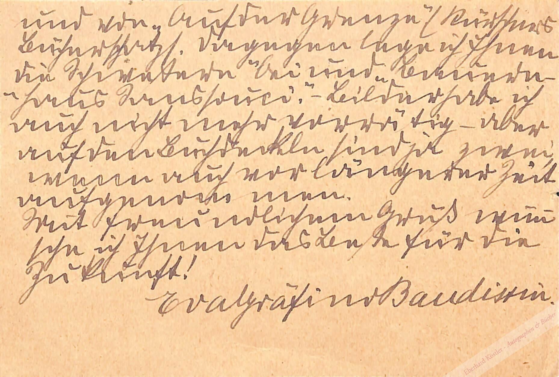 „… Ihre freundliche Anteilnahme an meinen Arbeiten freut mich sehr, ebenso Ihre Bestrebungen auf literarischem Gebiet. Leider konnte ich Ihnen nicht eher antworten, da ich verreist war und Ihnen doch gern einige kleine Bücher senden wollte. Von den „Entlobten“ (Verl.Bonze & Co. Stuttgart) habe ich leider kein Ex. mehr, ebenso wenig von „Danine Drautens“ (Reklam) und von „Auf der Grenze“ (Kürschners Bücherschatz) Dagegen lege ich Ihnen die „Die Schwestern“ bei und „Bauernhaus Sansouci“ – Leider habe ich auch nicht mehr vorrätig – aber auf den Buchdeckeln sind ja zwei, wenn auch vor längerer Zeit aufgenommenen. …“.