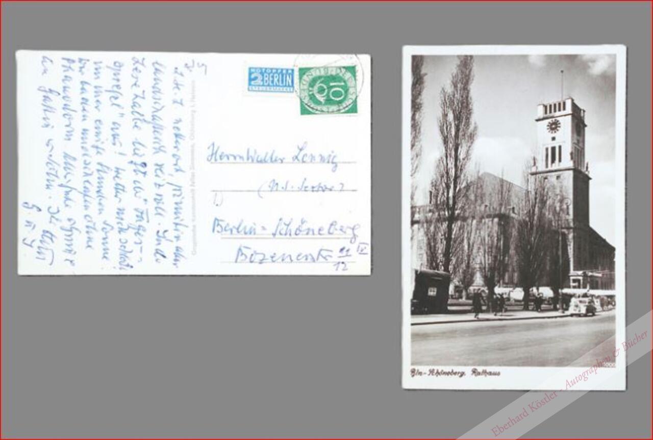 Benn dankt dem Journalisten und ersten Benn-Biografen Walter Lennig (1902-1968) für Glückwünsche zu seinem Geburtstag: „… Auf Wiedersehen. Ihr ergebenster Benn“. – Die Karte zeigt das Rathaus in Berlin Schöneberg. – Benn und Lennig lebten in unmittelbarer Nachbarschaft. Sie kannten sich seit 1947, als Lennig die Erstausgabe der „Statischen Gedichte“ rezensierte. „Es wurde der Beginn eines jahrelangen Gesprächs“, das die beiden in den Schöneberger Kneipen führten. 1962 veröffentlichte Lennig in der Reihe „Rowohlts Monographien“ den Band über Gottfried Benn (Nr. 71): „Dieses Buch mit seinen rund 180 Seiten war 1962 die erste ausführliche Darstellung von Leben und Werk des Dichters. Es wurde zu einem Bestseller …“. – Vgl. Peter Kröger, „Bewachen Sie Dramburg, selige Erinnerung …!“, in: Mitteilungen der Gottfried-Benn-Gesellschaft, Jg. 11, Heft 34.