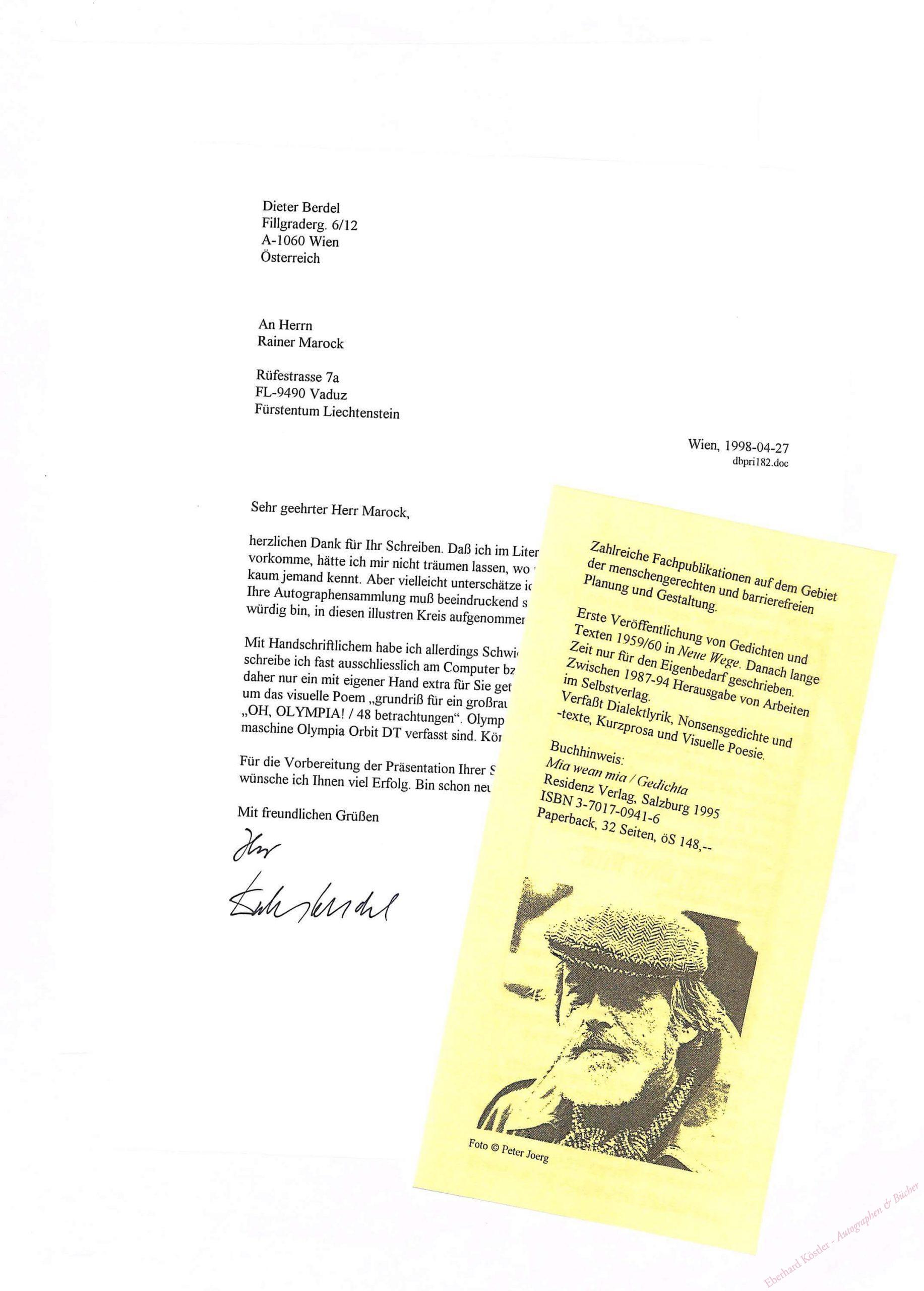 Gedichttyposkript mit eigenhändiger Unterschrift sowie masch. Begleibrief mit eigenhändiger Unterschrift Wien, 27. IV. 1998, Fol. Zus. 2 Seiten. – „grundriß für ein großraumbüro“, Figurengedicht..