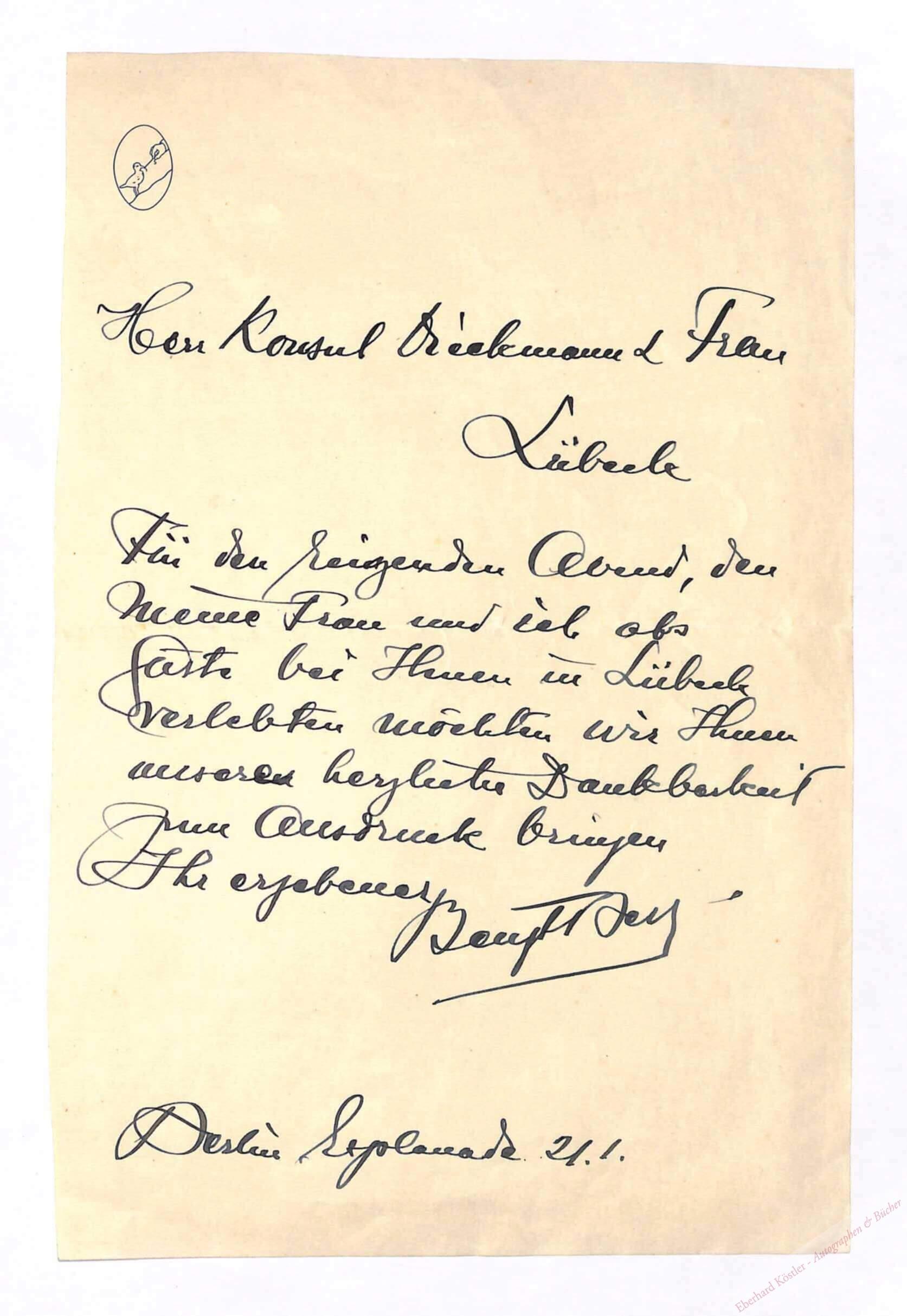 An Herrn und Frau Konsul Dieckmann in Lübeck mit Dank für einen „reizenden Abend“. – Reinhard (1879-1958) und Lilly (1882-1958) Dieckmann führten einen berühmten musikalischen Salon. – Beiliegend: Gedruckte Visitenkarte.