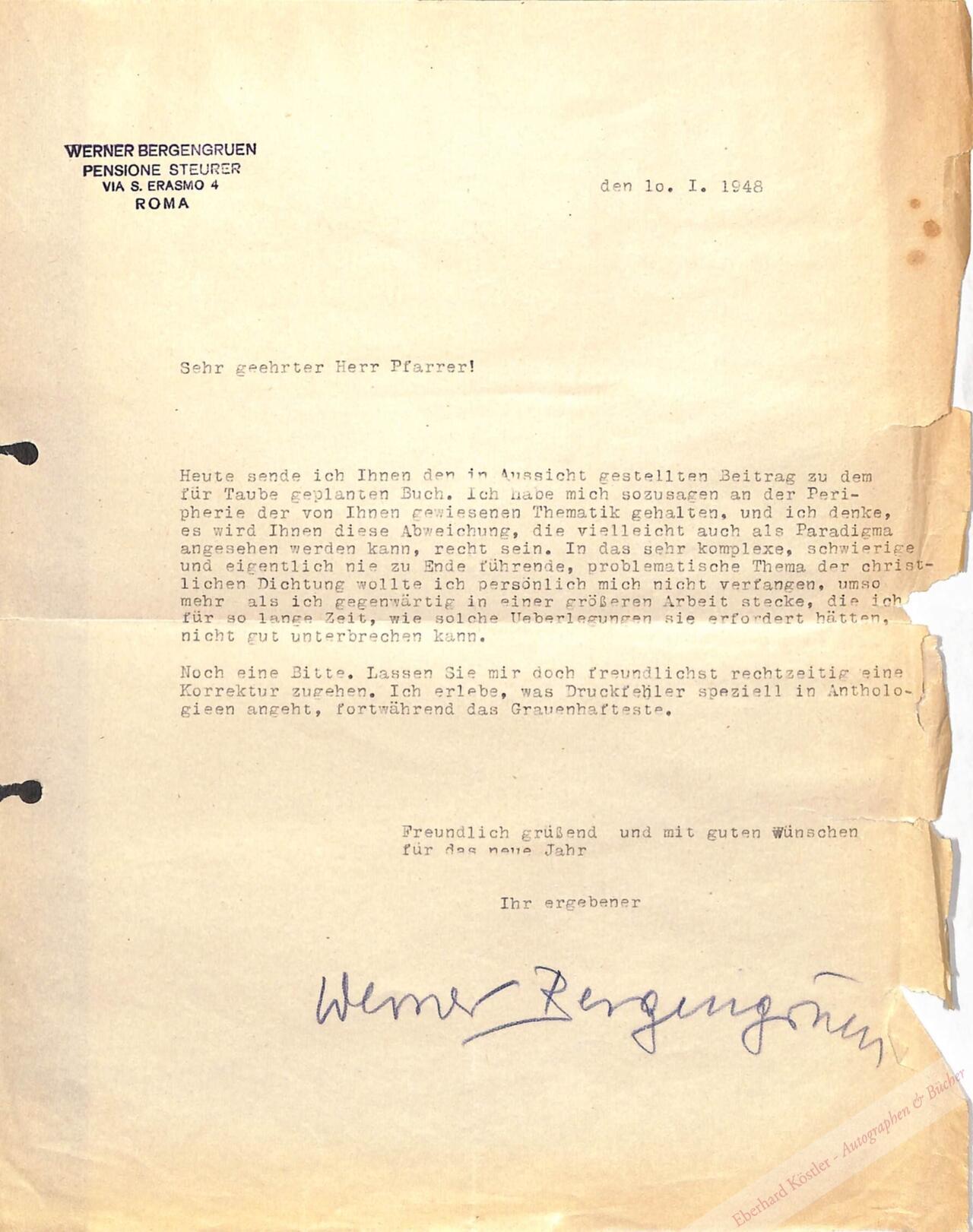 An einen Pfarrer: „… Heute sende ich Ihnen den in Aussicht gestellten Beitrag zu dem für (Otto von) Taube geplanten Buch. Ich habe mich sozusagen an der Peripherie der von Ihnen gewiesenen Thematik gehalten, und ich denke, es wird Ihnen diese Abweichung, die vielleicht auch als Paradigma angesehen werden kann, recht sein. In das sehr komplexe, schwierige und eigentlich nie zu Ende führende, problematische Theme der christlichen Dichtung wollte ich persönlich mich nicht verfangen, umso mehr,als ich gegenwärtig in einer größeren Arbeit stecke …“ – Kleinere Randläsuren, ohne Textverlust.
