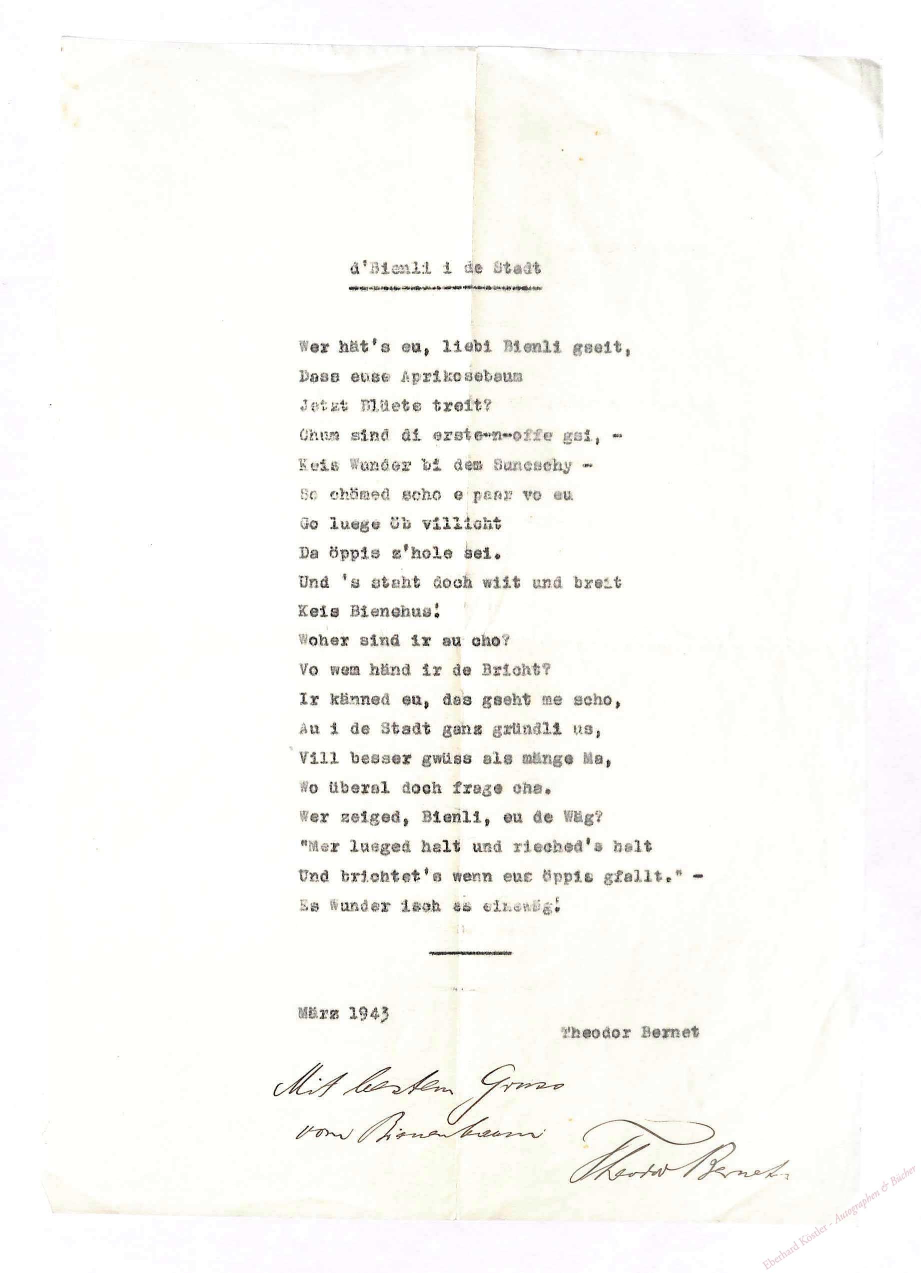 „d’Bienli i de Stadt“. – Widmung „Mit bestem Gruss vom Bienenbaum Theodor Bernet“.