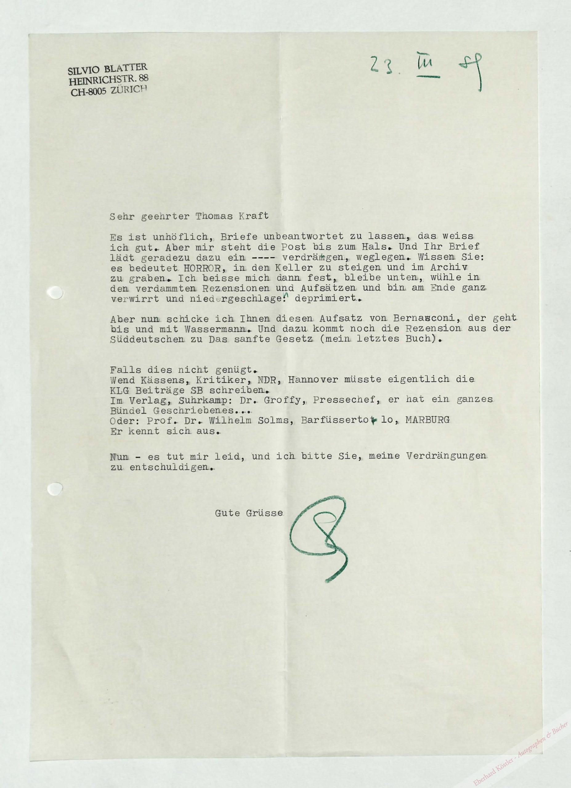 „[…] Es ist unhöflich, Briefe unbeantwortet zu lassen, das weiss ich gut. Aber mir steht die Post bis zum Hals. Und Ihr Brief lädt gerade dazu ein —- verdrängen, weglegen. Wissen Sie: es bedeutet HORROE, in den Keller zu steigen und im Archiv zu graben. Ich beisse mich dann fest, bleibe unten, wühle in den verdammten Rezensionen und Aufsätzen und bin am Ende ganz verwirrt und niedergeschlagen: deprimiert […]“. – Gelocht.