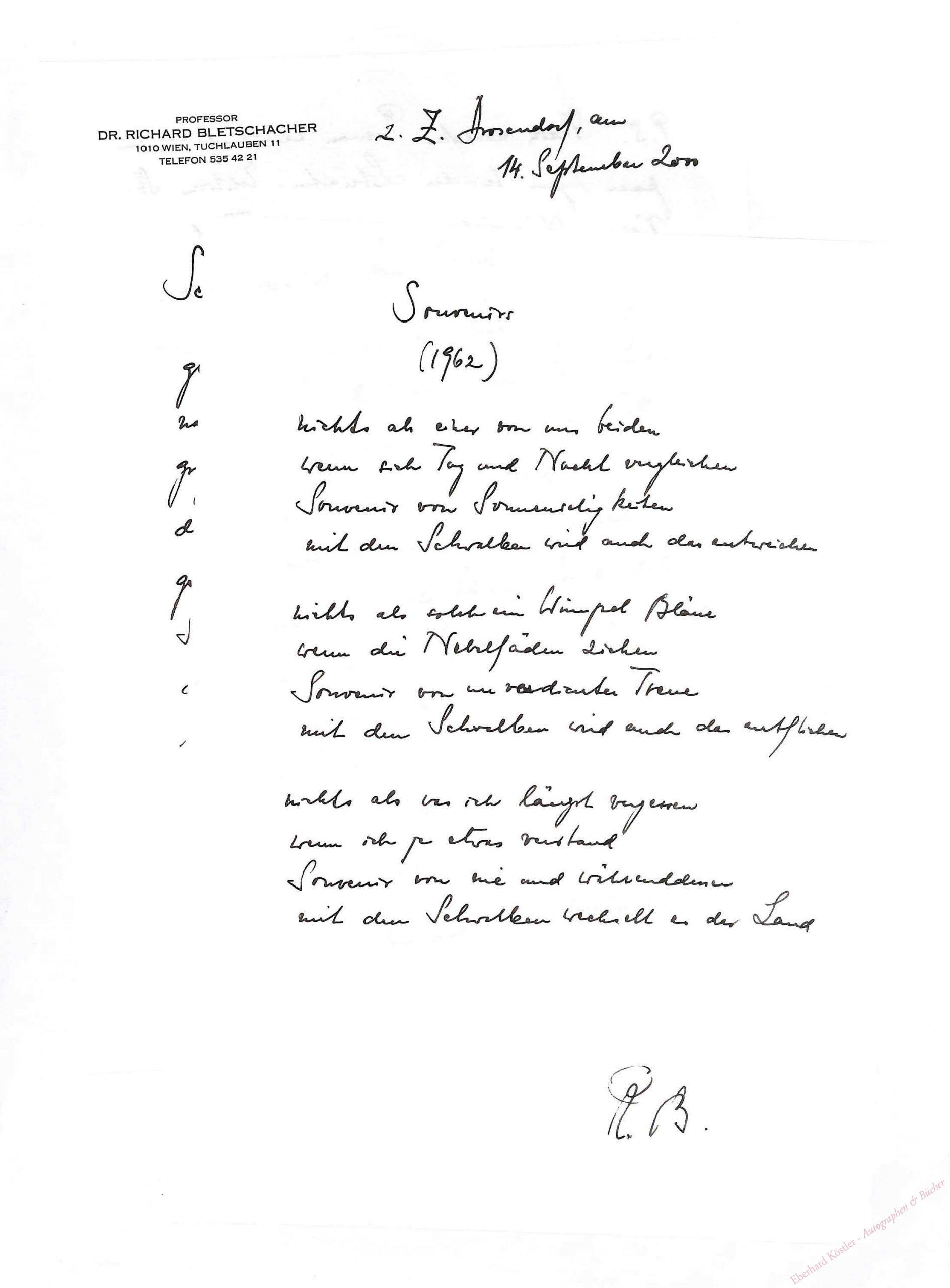 Eigenhändiges Gedichtmanuskript (12 Zeilen) mit Unterschrift sowie eigenh. Begleitbrief mit Unterschrift Drosendorf an der Thaya, 14. X. 2000, Fol. Zus. 2 Seiten. – „Souvenirs (1962)“..