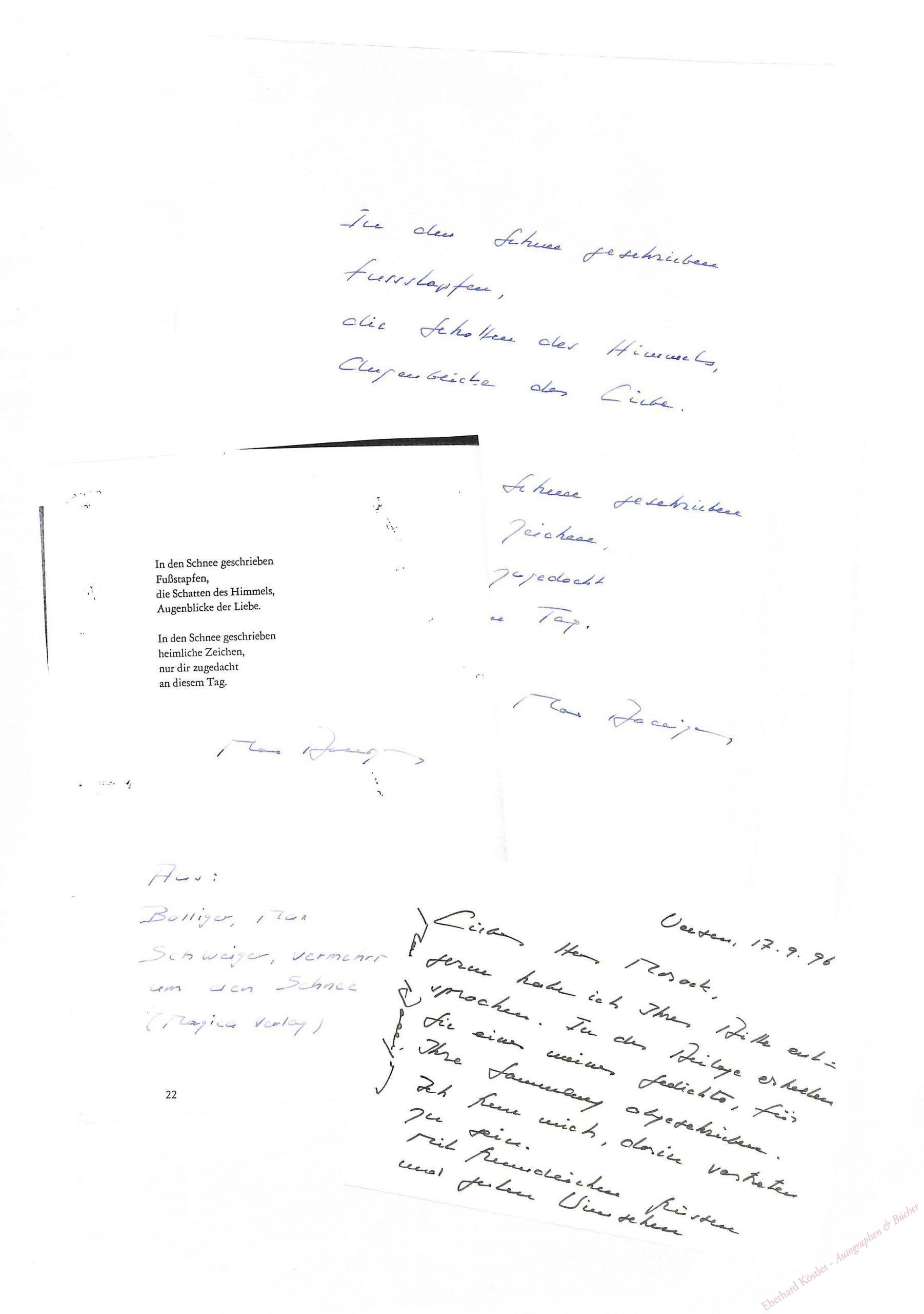 Eigenhändiges Gedichtmanuskript (8 Zeilen) mit Unterschrift und eigenh. Begletkarte mit Unterschrift Weesen, 17. IX. 1996, Verschied. Formate. Zus. 2 Seiten. – „In den Schnee geschrieben“ aus dem Band „Schweigen, vermehrt um den Schnee“..