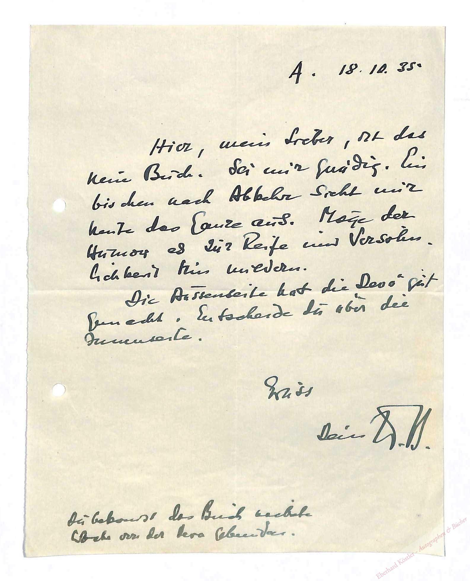 „Hier, mein Lieber, ist das neue Buch. Sei mir gnädig. Ein bischen nach Abkehr sieht mir heute das Ganze aus. Möge der Humor es zur Reife und Versöhnlichkeit hin mildern. Die Aussenseite hat die ‚Deva‘ gut gemacht. Entscheide du über die Innenseite […]“ – Gemeint ist wahrscheinlich „Der Reiter in der Wüste“ (Stuttgart, DVA, 1935).