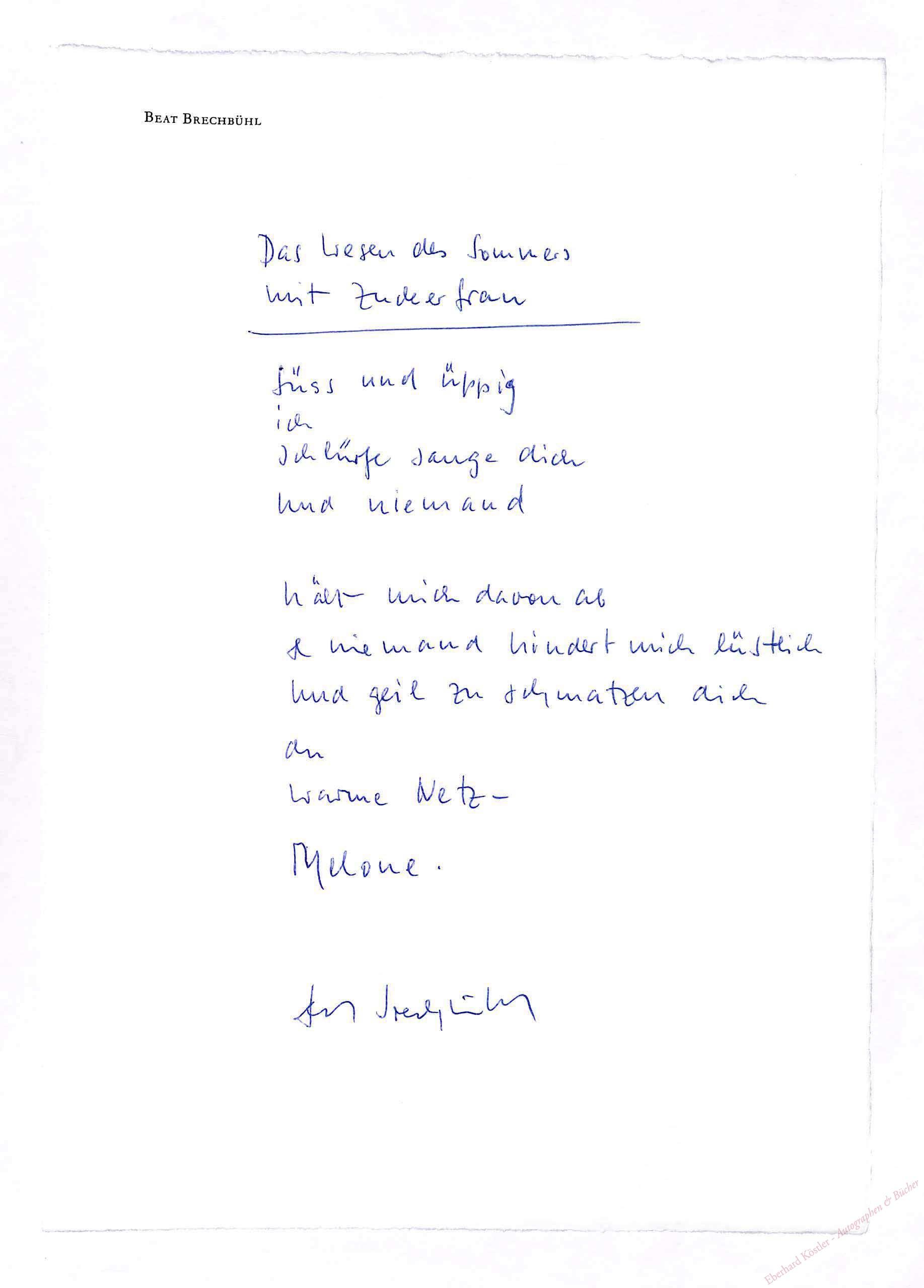 Eigenhändiges Gedichtmanuskript (Zeilen) mit Unterschrift , Ohne Ort und Jahr (1991), Fol. 1 Seite. – „Das Wesen des Sommers mit Zuckerfrau“, auf Bütten..