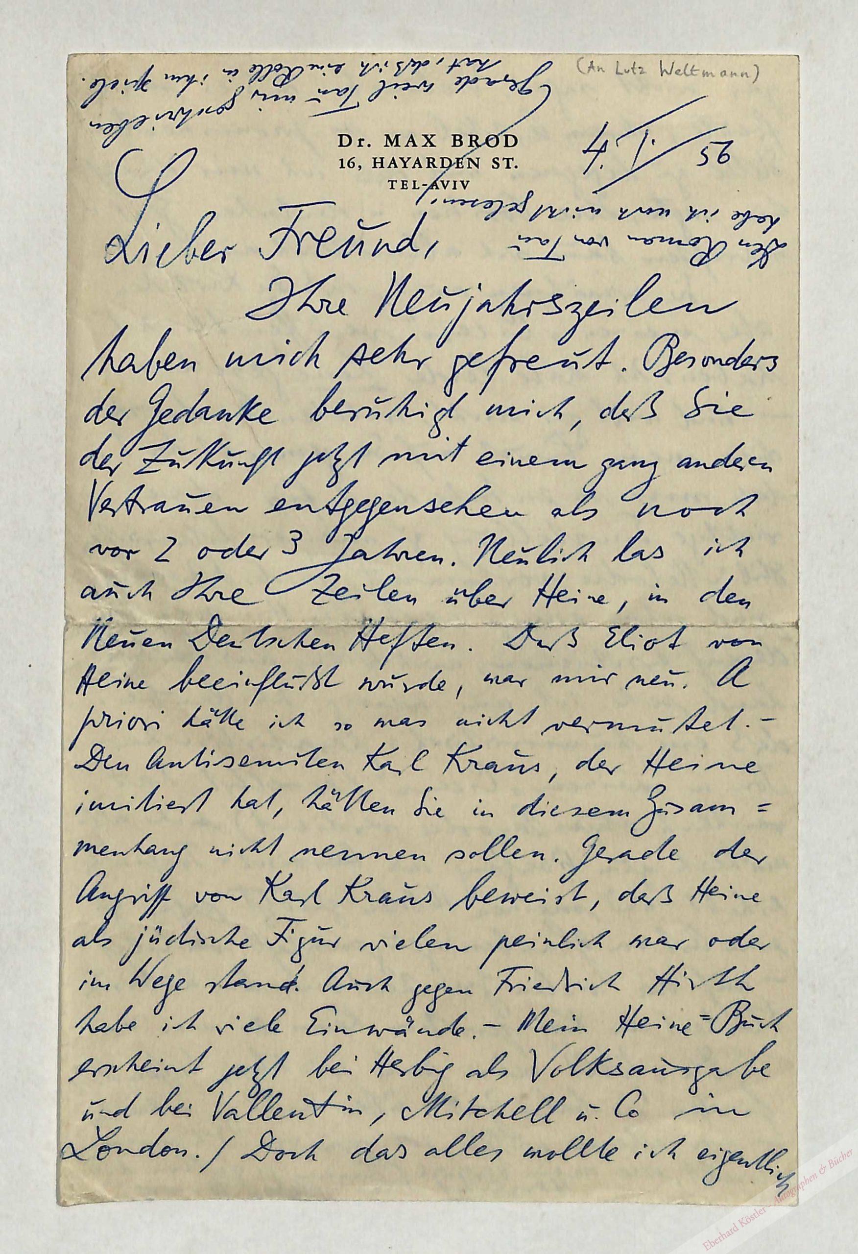 An den Schriftsteller Lutz Weltmann (1901-1967) in London: „[…] Neulich las ich auch Ihre Zeilen über Heine, in den Neuen Deutschen Heften. Daß Eliot von Heine beeinflußt wurde, war mir neu. A priori hätte ich sowas nicht vermutet. – Den Antisemiten Karl Kraus, der Heine imitiert hat, hätten Sie in diesem Zusammenhang nicht nennen sollen. Gerade der Angriff von Karl Kraus beweist, daß Heine als jüdische Figur vielen peinlich war oder im Wege stand. Auch gegen Friedrich Hirth habe ich viele Einwände. – Mein Heine-Buch erscheint jetzt bei Herbig als Volksausgabe […]“ Weiter ausführlich über seinen Cicero-Roman.