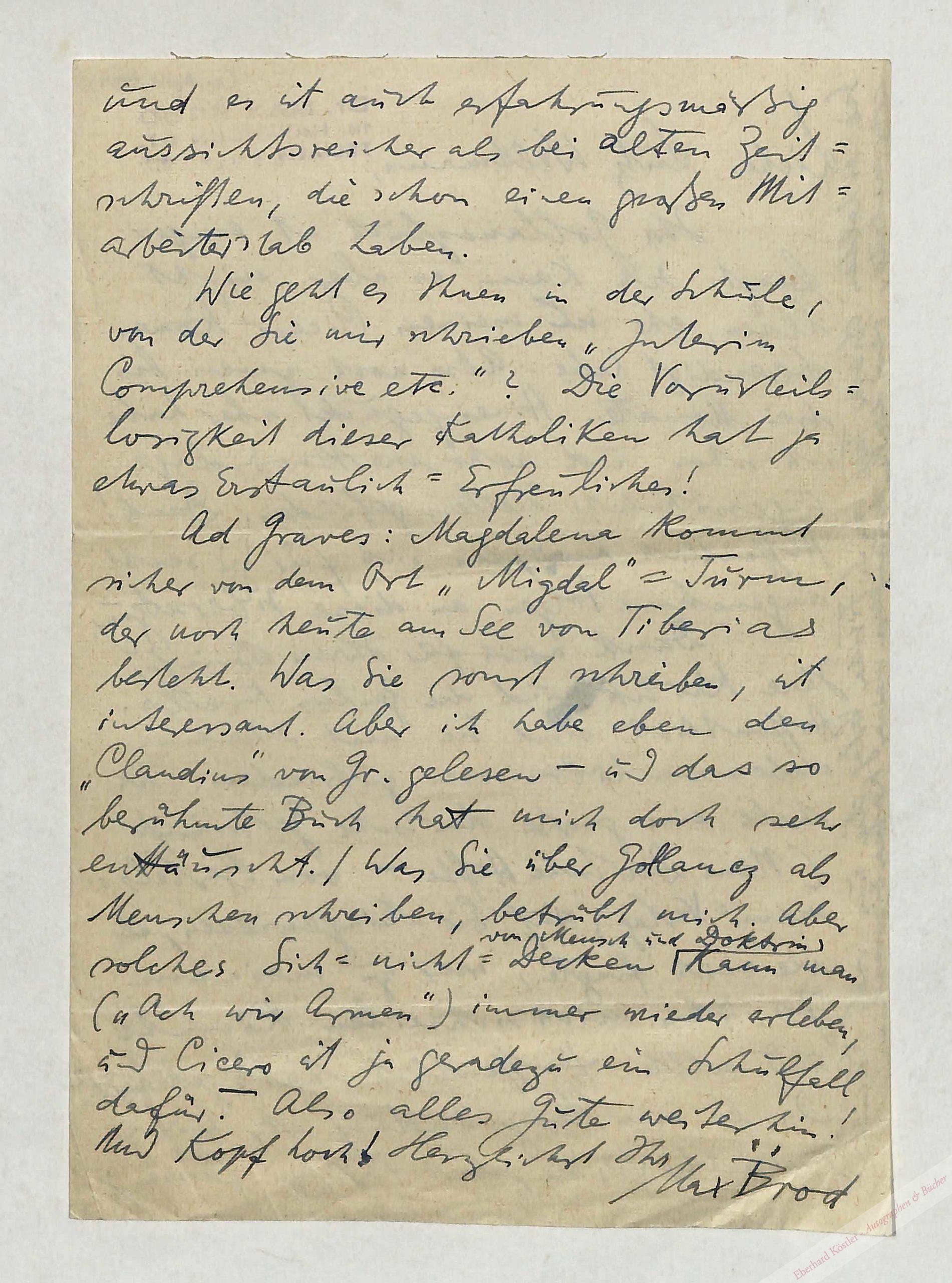 An den Schriftsteller Lutz Weltmann (1901-1967) in London: „[…] Ihr Gollanczbuch ist eingelangt. Ich kann es aber nicht lesen, ehe ich meinen Cicero-Roman beendigt habe. Also noch zwei bis drei Monate. Hinein geguckt aber habe ich schon und sehr merkwürdige ungewöhnliche Stellen gefunden. Dank! Hoffentlich knüpfen sich für Sie recht angenehme Folgen an diese Übersetzung […] Was sie sonst schreiben, ist interessant. Aber ich habe eben den ‚Claudius‘ von Gr[aves] gelesen – und das so berühmte Buch hat mich doch sehr enttäuscht. Was Sie über Gollancz als Menschen schreiben, betrübt mich. Aber solches sich-nicht-Decken von Mensch und Doktrin kann man (‚Ach wir Armen‘) immer wieder erleben, und Cicero ist ja geradezu ein Schulfall dafür […] Sie erhalten dieser Tage vom S. Fischer Verlag die um viele Kapitel vermehrte, revidierte Neuauflage meiner Kafka-Biografie.“