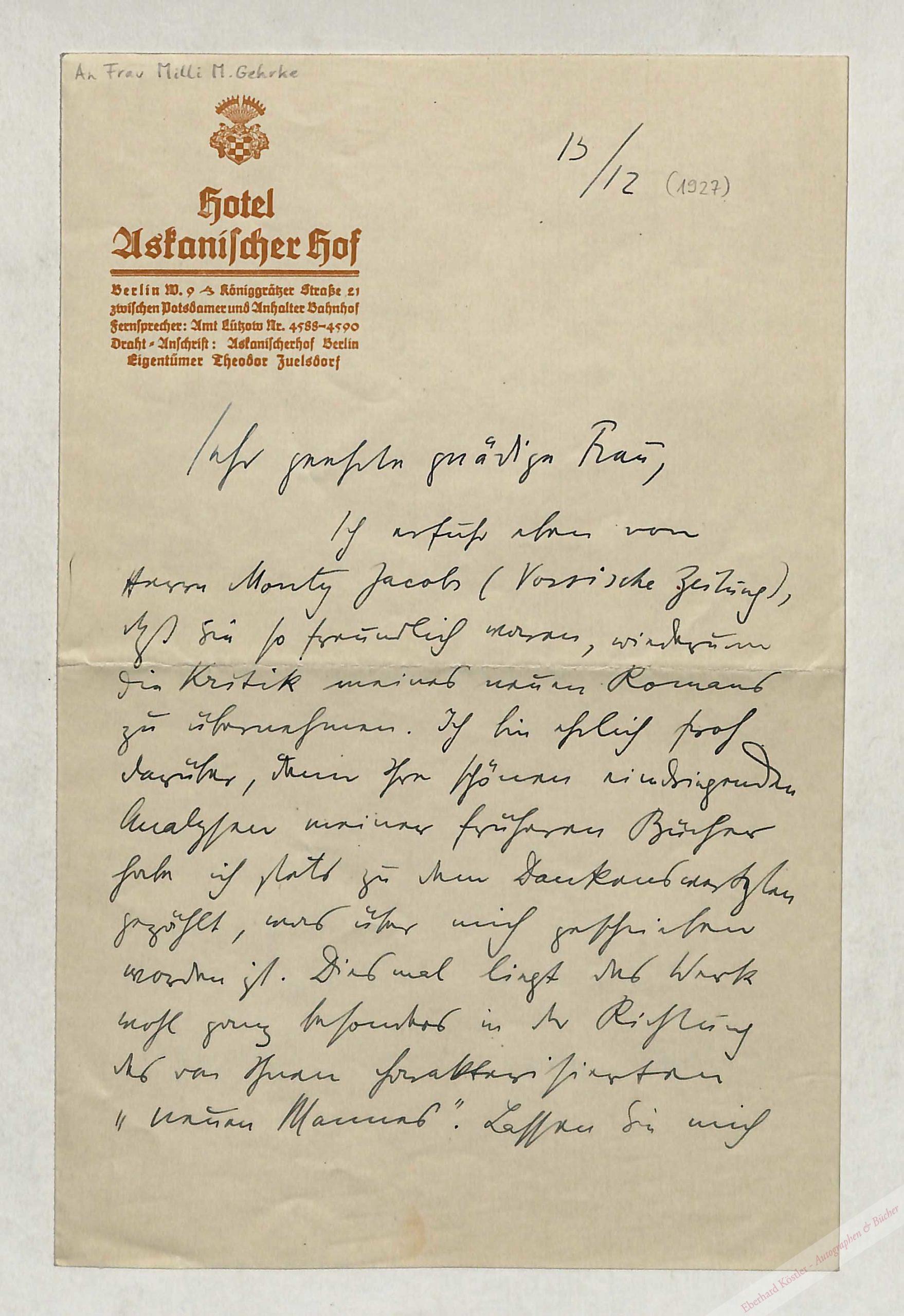 An die Kritikerin und Mitarbeiterin der „Weltbühne“ Martha Maria (Milli) Gehrke (1904-1986) in Frankfurt am Main: „[…] Ich erfuhr eben von Herrn Monty Jacobs (Vossische Zeitung), daß Sie so freundlich waren, wiederum die Kritik meines neuen Romans [‚Die Frau, nach der man sich sehnt‘] zu übernehmen. Ich bin ehrlich froh darüber, denn Ihre schönen eindringenden Analysen meiner früheren Bücher habe ich stets zu dem Dankenswertesten gezählt, was über mich geschrieben worden ist. Diesmal liegt das Werk wohl ganz besonders in der Richtung des von Ihnen charakterisierten ’neuen Mannes‘. Lassen Sie mich Ihnen bei dieser Gelegenheit noch recht herzlich Dank sagen für Ihr Verständnis meiner tieferen Wesenheit. – Und noch die Bitte: die Kritik recht bald an die ‚Voss‘ zu senden, – denn vor Weihnachten wäre sie besonders wichtig! Das Buch ist ohnehin mein stärkster Erfolg, erscheint demnächst in 3. Auflage […]“