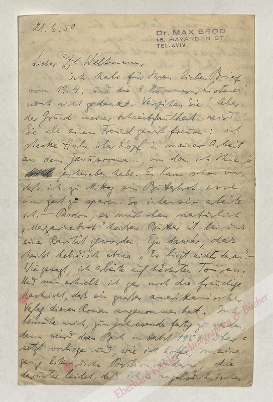 An den Schriftsteller Lutz Weltmann (1901-1967) in London: „[…] der Grund meiner Schreibfaulheit wird Sie als einen Freund gewiß freuen: ich stecke Hals über Kopf in meiner Arbeit an dem Jesusroman, von dem ich Ihnen ja geschrieben habe. Es kam schon vor, daß ich zu Mittag ein Butterbrot esse, um Zeit zu sparen. So intensiv arbeite ich. – Pardon, es muß oben natürlich Margarinebrot heißen. Butter ist bei uns eine Rarität geworden. Ejn dawar, das heißt Hebräisch etwa: ‚Es liegt nichts daran‘. – Wie gesagt, ich arbeite auf höchsten Touren. Und nun erhielt ich gar noch die freudige Nachricht, daß ein großer amerikanischer Verlag diesen Roman angenommen hat. Ich bemühe mich, zum Jahresende fertig zu werden, dann wird das Buch im Herbst 1951 übersetzt vorliegen und, wie ich hoffe, meine ganze literarische Position ändern, die darunter leidet, daß ich in angelsächsischen Ländern wenig bekannt bin […] Daß Sie aber schon heute für das Verständnis meiner Werke kämpfen: dafür bin ich Ihnen aufrichtig dankbar. Bin schon sehr gespannt auf ihren Essay in ‚German Life and Letters‘. Wann erscheint er? Ich weiß nicht genau, ob ich Ihnen mein Buch ‚Diesseitswunder‘ geschickt habe. Ich wollte es tun, lebe aber jetzt so fanatisch in meinem neuen Roman, daß ich vieles vergesse oder falsch erledige […] Besonders hat mich gefreut, daß Sie einiges für Ihr Leben aus meiner Unterscheidung ‚Edles‘ und ‚unedles‘ Unglück entnommen haben. Bei Diskussionen, die ich hier mit der Jugend eines Gymnasiums über Kafka hatte (in hebräischer Sprache!), zeigte es sich, wie diesen radikalisierten Linkselementen gegenüber meine Unterscheidung fruchtbar werden könnte, – wenn, ja wenn man von ihr Notiz nähme. Kein Zweifel, das wird noch kommen aber inzwischen kann die Welt kaputtgeschlagen sein. Wundervoll und völlig meine Auffassung deckend ist der von Ihnen zitierte Goethe-Vierzeiler über Jesus. Wo steht er? Ich kannte ihn nicht […]“ – Weltmanns Aufsatz „Kafka’s Friend, Max Brod: The Work of a Mediator“ erschien in: German Life and Letters, vol. IV/1, October 1950, p. 46-50. Mit dem Vierzeiler Goethes ist wohl „Jesus fühlte rein und dachte […]“ aus dem West-Östlichen Diwan (An Suleika) gemeint.