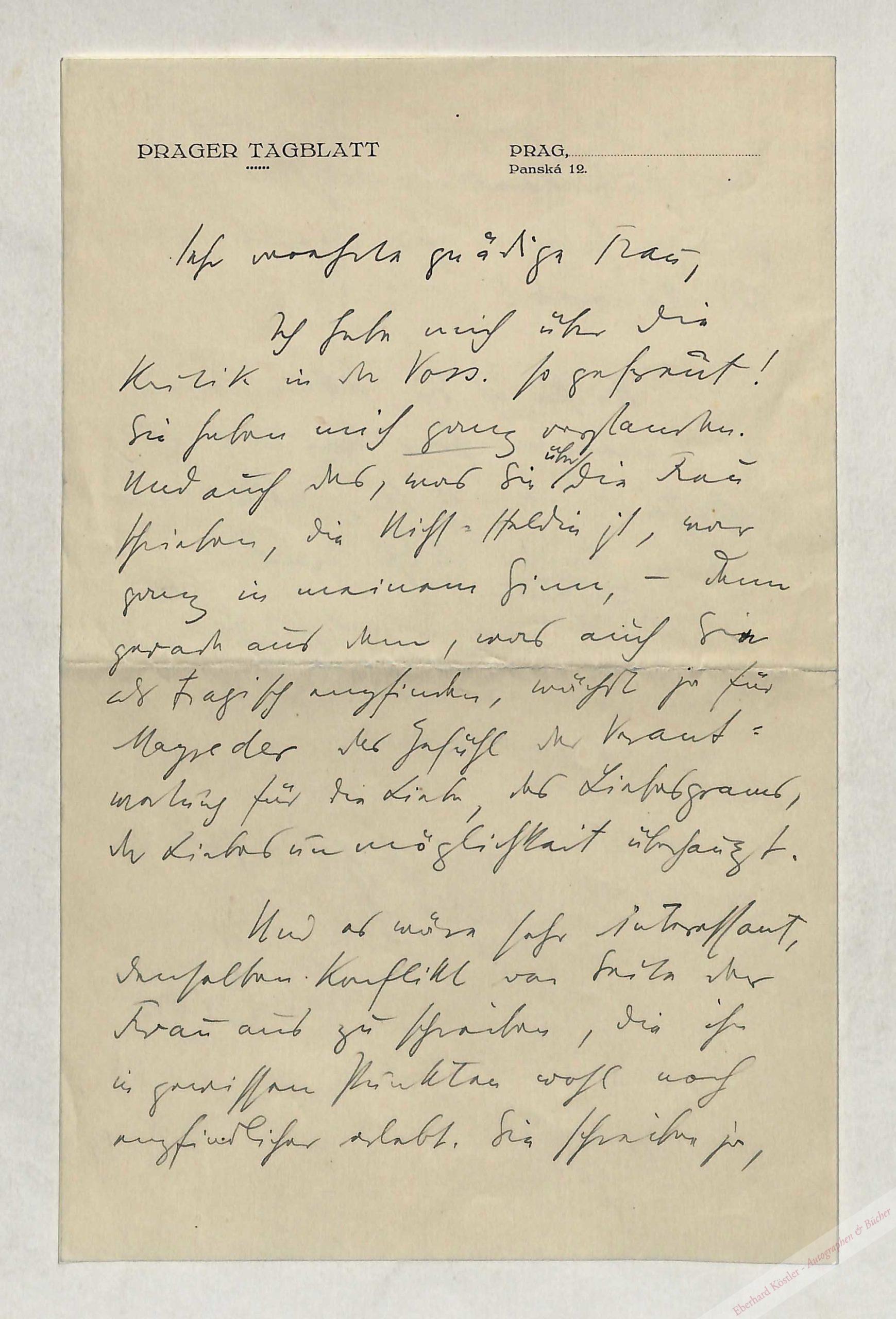 An die Kritikerin und Mitarbeiterin der „Weltbühne“ Martha Maria (Milli) Gehrke (1904-1986) in Frankfurt am Main, wegen seines Romans „Die Frau, nach der man sich sehnt“ (1927): „[…] Ich habe mich über die Kritik in der Voss. so gefreut! Sie haben mich ganz verstanden. Und auch das, was Sie über die Frau schrieben, die Nicht-Heldin ist, war ganz in meinem Sinne, – denn gerade aus dem, was auch Sie als tragisch empfinden, wächst ja für Mayreder das Gefühl der Verantwortung für die Liebe, des Liebesgrams, der Liebesunmöglichkeit überhaupt. Und es wäre sehr interessant, denselben Konflikt von Seite der Frau aus zu schreiben, die ihn in gewissen Punkten wohl noch empfindlicher erlebt. Sie schreiben ja, daß Sie das vorhaben. Ein solches Buch (oder Novelle) müßte viel zu sagen haben – für Frauen wie für Männer! […]“