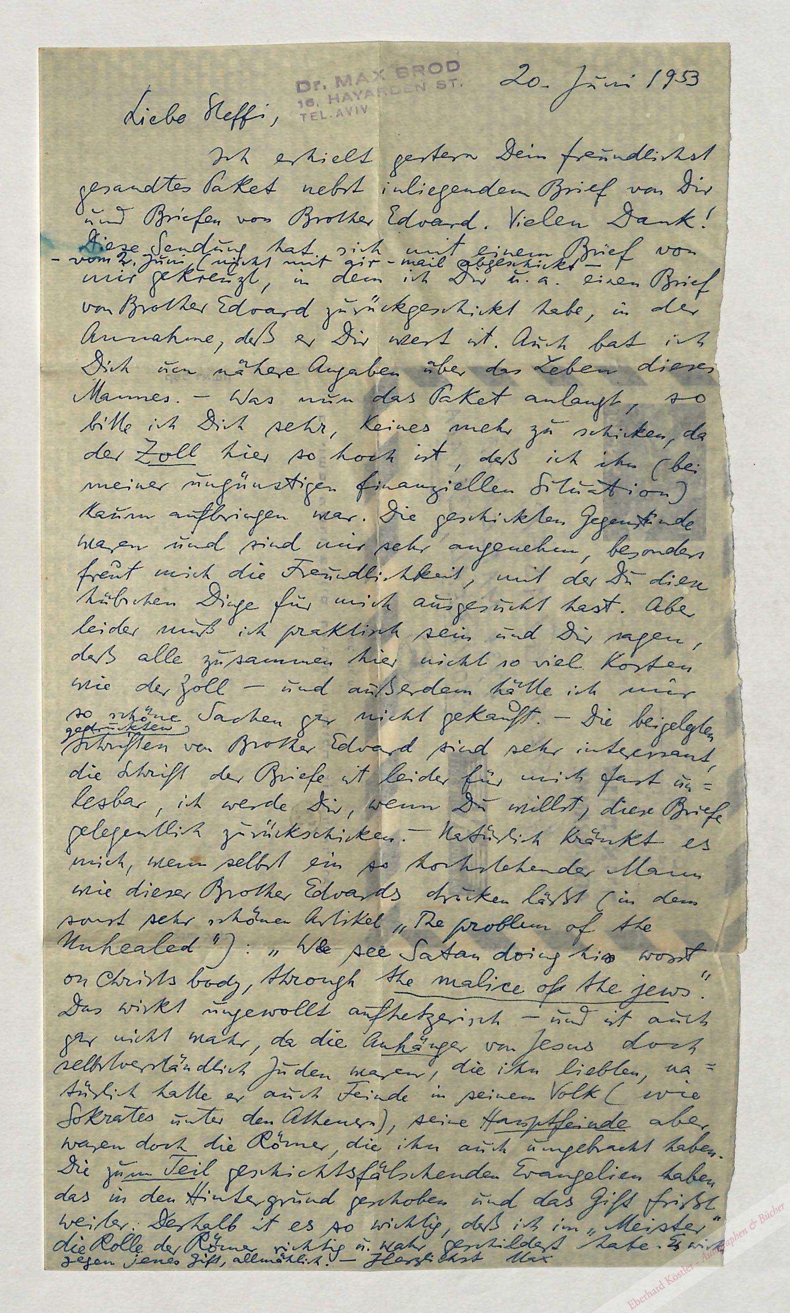 An seine Cousine Steffi Glaser (Schwester von Willy Brod) in Montreal mit Dank für eine Sendung mit Geschenken sowie über Briefe eines „Brother Edvard“: „[…] Das wirkt ungewollt aufhetzerisch – und ist auch gar nicht wahr, da die Anhänger von Jesus doch selbstverständlich Juden waren, die ihn liebten, natürlich hatte er auch Feinde in seinem Volk (wie Sokrates unter den Athenern), seine Hauptfeinde aber waren doch die Römer, die ihn auch umgebracht haben. Die zum Teil geschichtsfälschenden Evangelien haben das in den Hintergrund geschoben und das Gift frißt weiter. Deshalb ist es so wichtig, daß ich im ‚Meister‘ die Rolle der Römer richtig und wahr geschildert habe. Es wirkt gegen jenes Gift, allmählich […]“