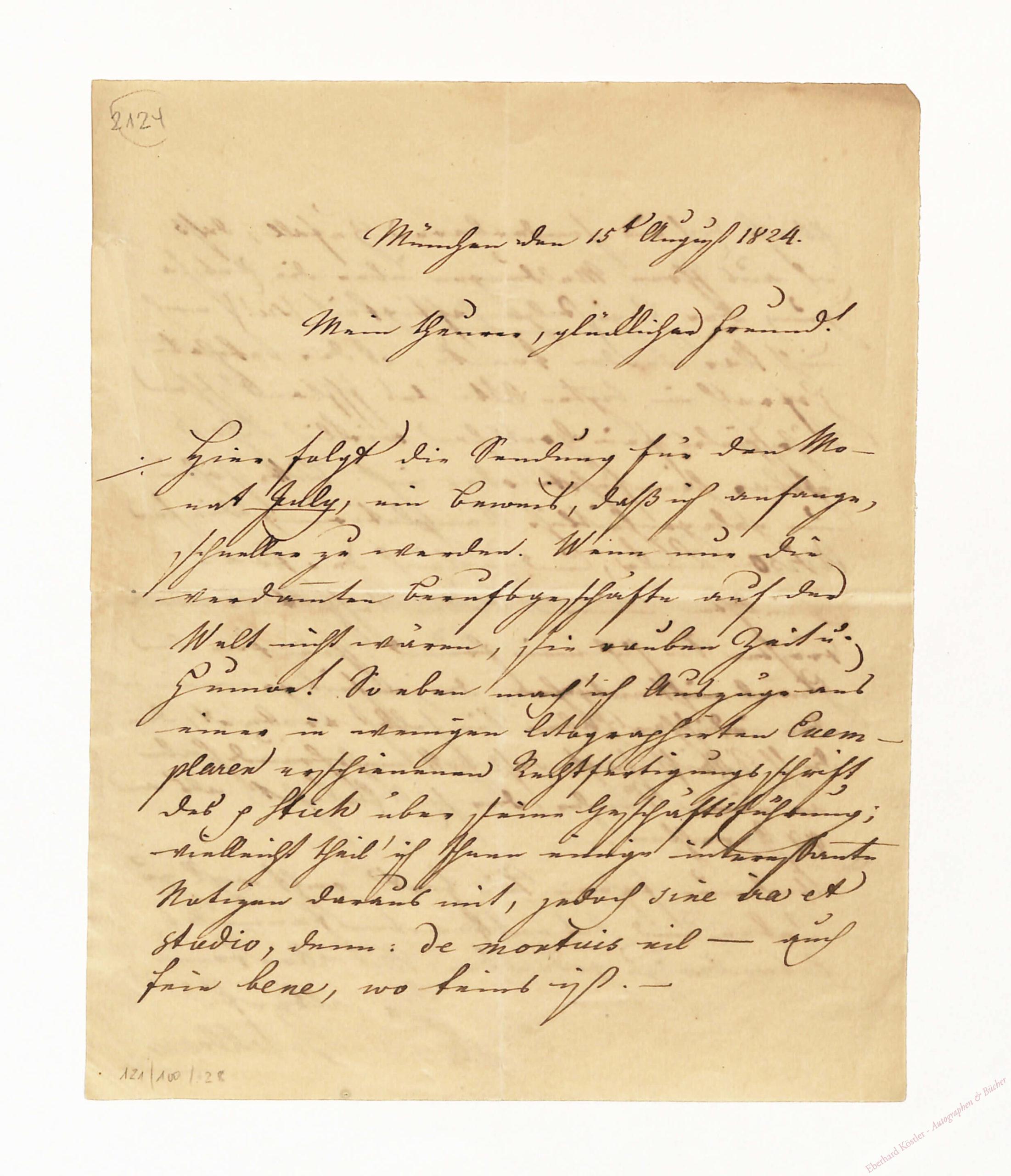 An einen Freund: „[…] Hier folgt die Sendung für den Monat July, ein Beweis, daß ich anfange, schneller zu werden. Wenn nur die verdammten Berufsgeschäfte auf der Welt nicht wären, sie rauben Zeit und Humor! So eben mach‘ ich Auszüge aus einer in wenigen litographischen Exemplaren erschienenen Rechtfertigungsschrift des H. Stich über seine Geschäftsführung […] Es ist doch ein sonderbarer Zufall, daß ich aus Ihren Meldungen über die Entsagung der Hagestolzenhaftigkeit […] noch nicht klar klar werden konnte, ob der bekehrte Hofrath im letzten Akte des Iffland’schen Rührspieles [‚Die Hagestolzen‘; 1793] sein Grettchen wirklich schon ehrbar heimführte oder nicht. Bitte sohin um gelegentliche Kompletirung dieser Aviso-Lücke[…]“. – Der Schauspieler Wilhelm Stich (1794-1824) war Schüler Ifflands, Mitglied der Berliner Hofbühne und Gatte der Schauspielerin Auguste Crelinger; er starb erst am 3. Oktober 1824, womöglich an den Folgen mehrerer Dolchstiche, die ihm während einer Eifersuchtsszene der junge Graf Franz von Bluecher einige Wochen vorher beigebracht hatte. Bruckbräu war im Hauptberuf Zollbeamter, daneben Schriftsteller und Herausgeber der Zeitschriften „Eos“ und des „Bayerischen Beobachters“ (seit 1829). – Kleine Randeinrisse.