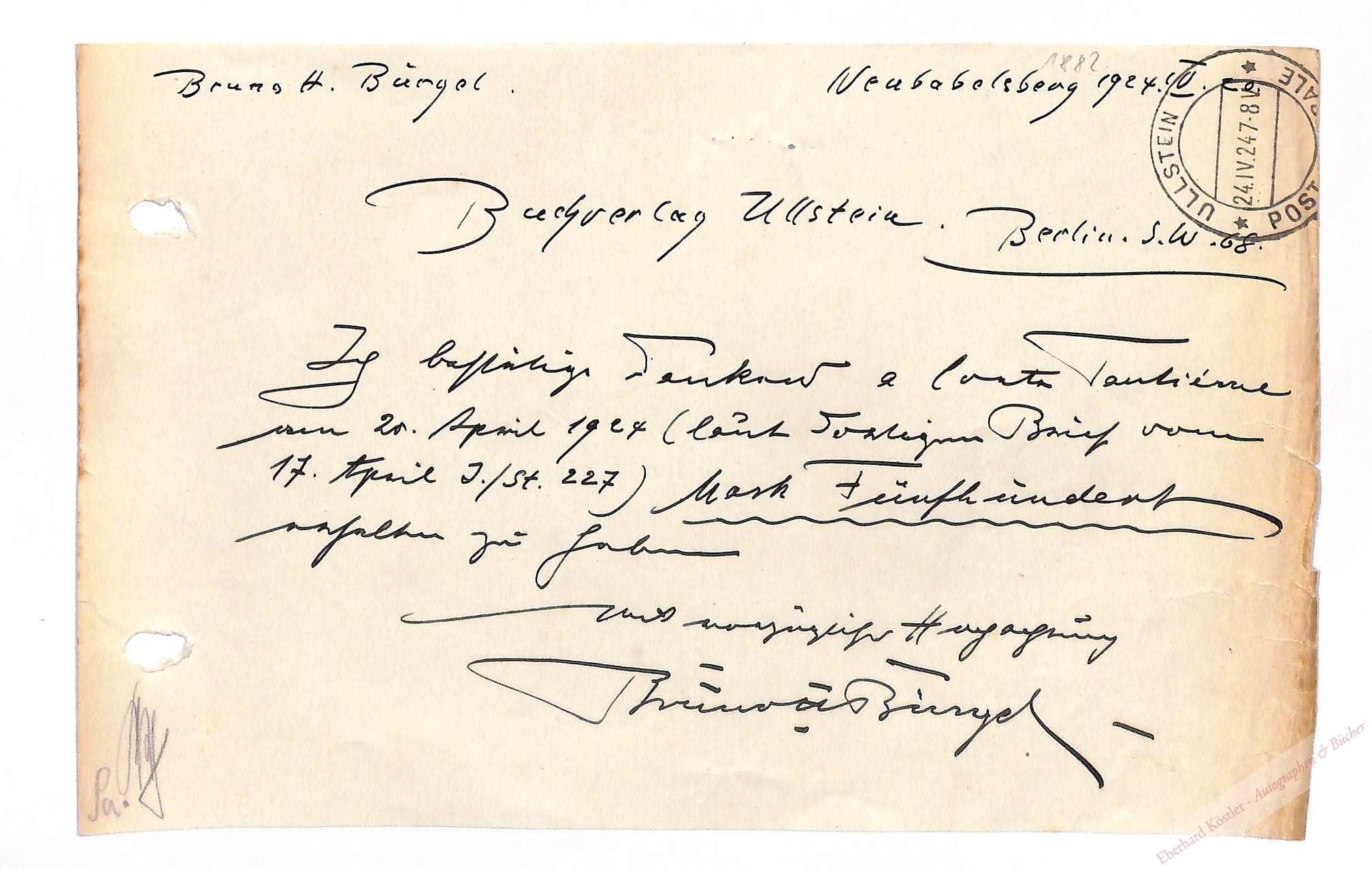 Tantiemenquittung für den Buchverlag Ullstein. – Bürgel schrieb „Vom Arbeiter zum Astronomen“ (1919). – Eingangsstempel.