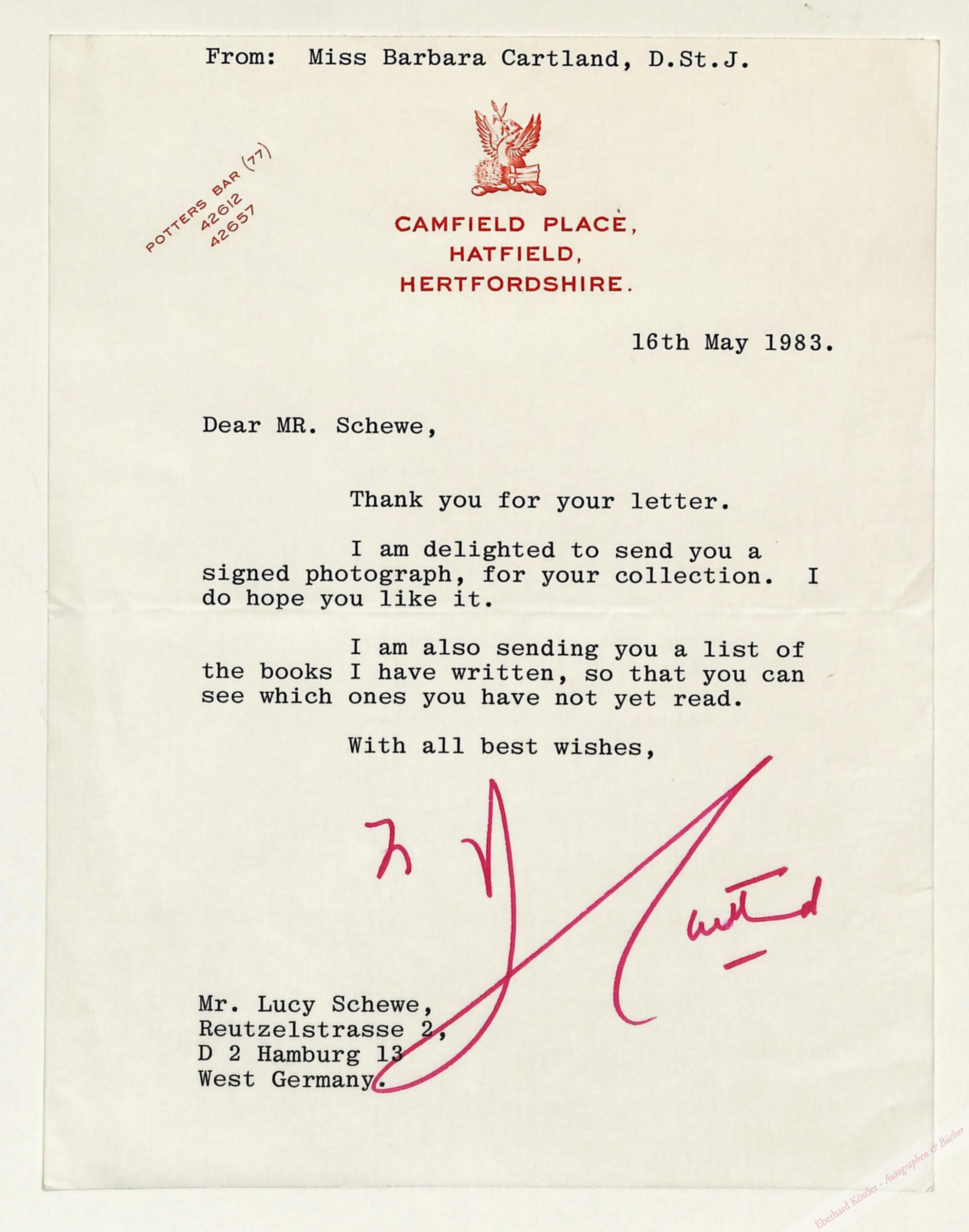 An Lucy Schewe in Hamburg, Gruß und Dank: „[…] I am also sending you a list of the books I have written, so that you can see which ones you have not yet read […]“.