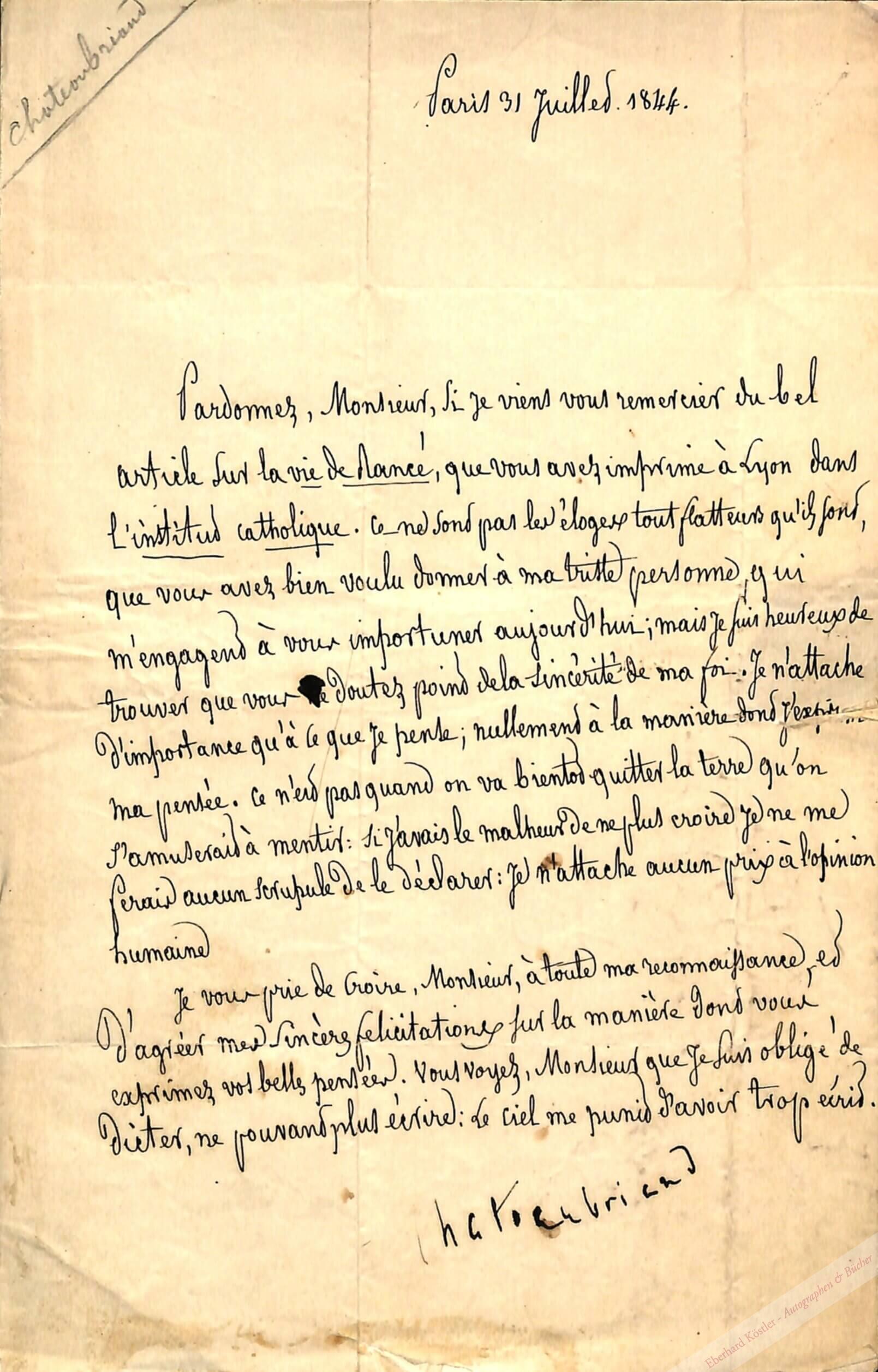 An Claudius Hebrad beim „Institut catholique“ in Lyon, dem er für einen Artikel über Chateaubriands letztes Buch „Vie de Rancé“ (1844) dankt: „[…] je suis hereux de trouver que vous ne doutez point de la sincérité de ma foi. Je n’attache d’importance qu’è ce que je pense […] Ce n’est pas quand on va bientôt quitter la terre qu’on s’amuserait à mentir: si j’avais le malheur de ne plus croire je ne me ferais aucun scrupule de le déclarer […] Vous voyez, Monsieur, que je suis obligé de dicter, ne pouvant plus écrire: Le ciel me punit d’avoir trop écrit […]“ – Armand Jean Le Bouthillier de Rancé (1626-1700) war Adeliger und Ordensreformator. – In den letzten Jahren seines Lebens war Chateaubriand durch schwere Gicht geschwächt und musste seine Briefe diktieren und mit zitternder Hand unterschreiben. – Leichte Altersspuren.