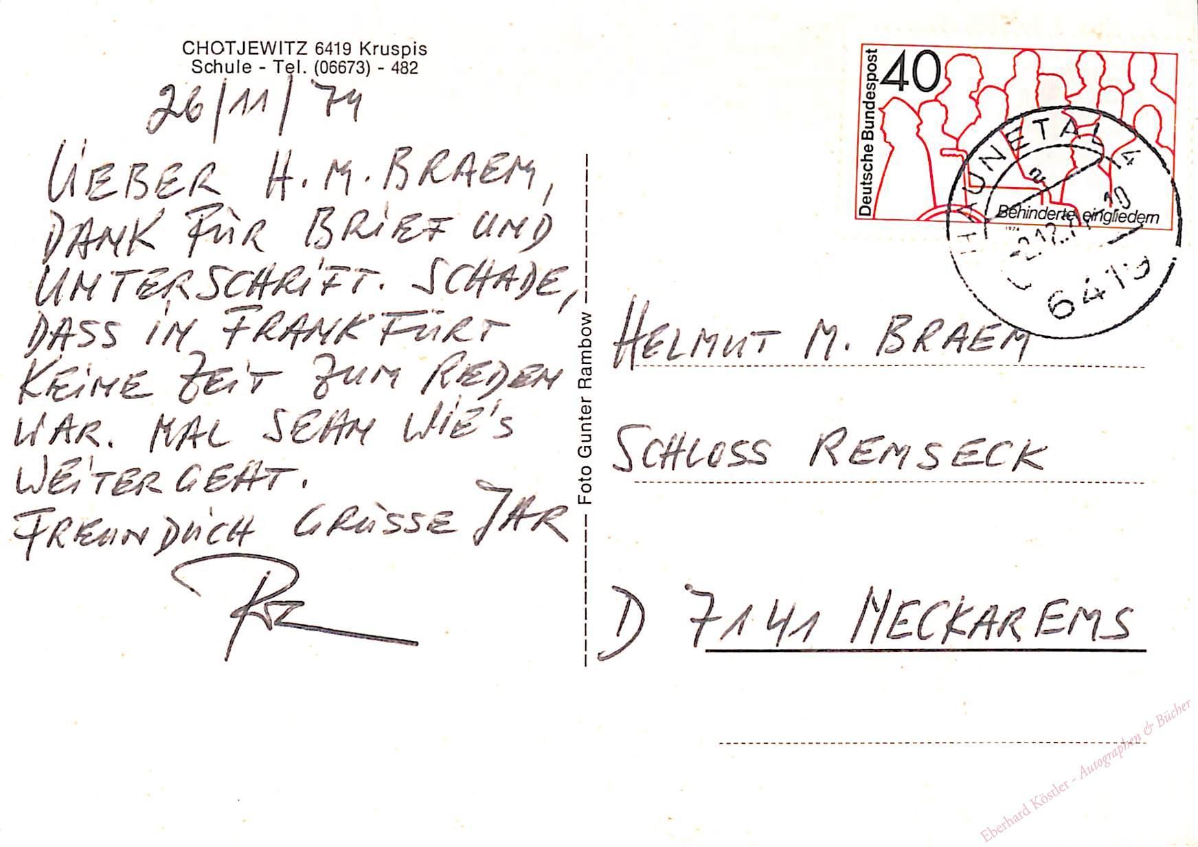 An Helmut M. Braem in Neckarems: „… Schade, dass in Frankfurt keine Zeit zum Reden war. Mal sehen, wie’s weitergeht …“ – Die Karte zeigt die Familie vor ihrem Haus in Kruspis.