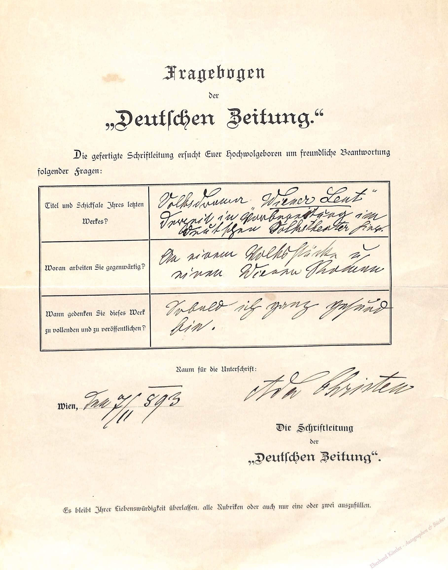 Fragebogen der Deutschen Zeitung: „… Titel und Schicksale Ihres letzten Werkes? Volksdrama ‚Wiener Leut‘ derzeit in Vorbereitung im Deutschen Volkstheater hier. Woran arbeiten Sie gegenwärtig? An einem Volksstück und einem Wiener Roman. Wann gedenken Sie dieses Werk zu vollenden? Sobald ich ganz gesund bin …“ – Gefördert durch Ferdinand von Saar und Theodor Storm veröffentlichte sie 1868 densozialkritischen Gedichtband „Lieder einer Verlorenen“. In ihrem Wiener Salon verkehrten u.a. Ludwig Anzengruber, Ludwig Ganghofer und Friedrich Hebbel.