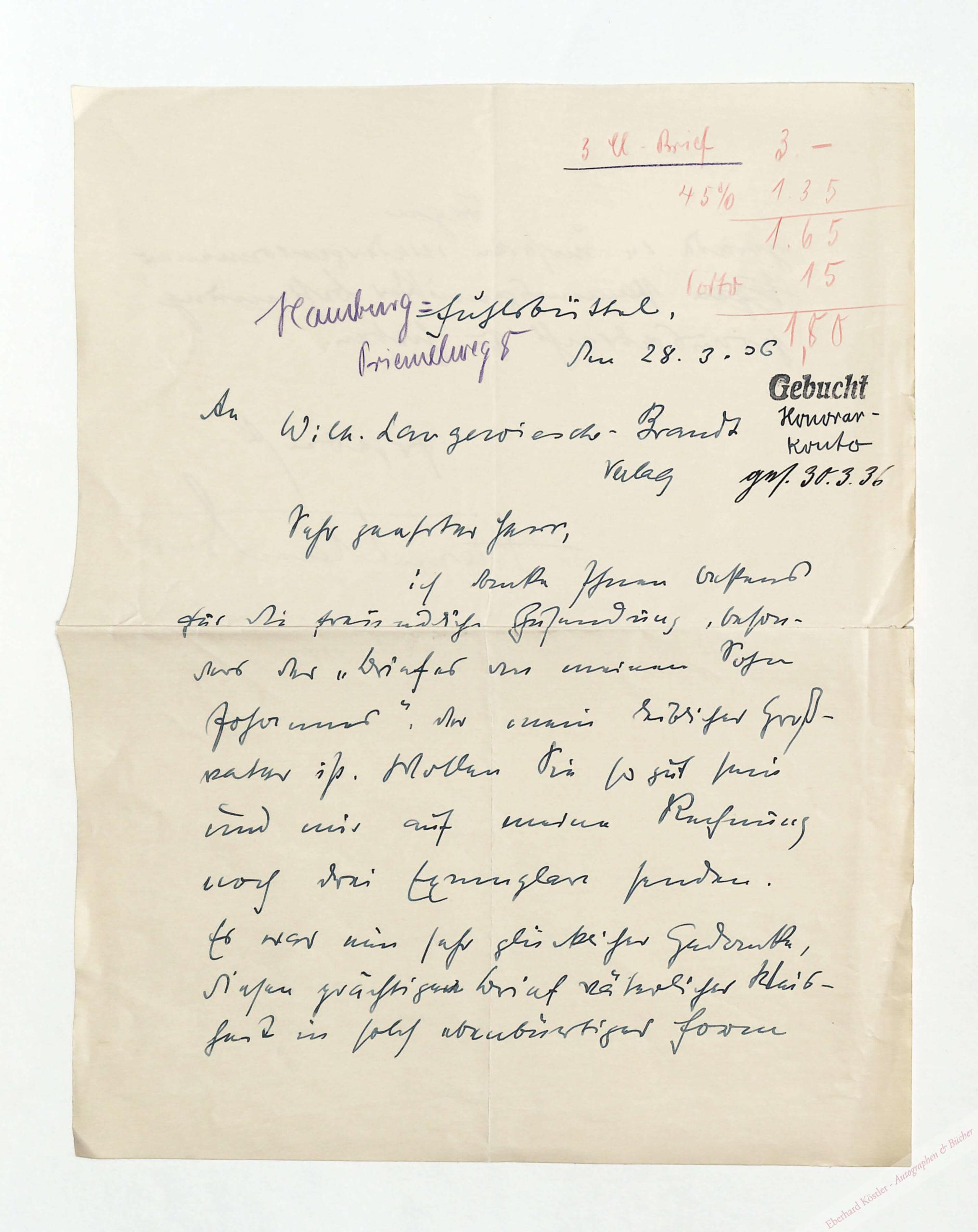 An den Schriftsteller Wilhelm Langewiesche (1866-1934) mit Dank für eine Ausgabe von Matthias Claudius‘ „Brief an meinen Sohn Johannes“.
