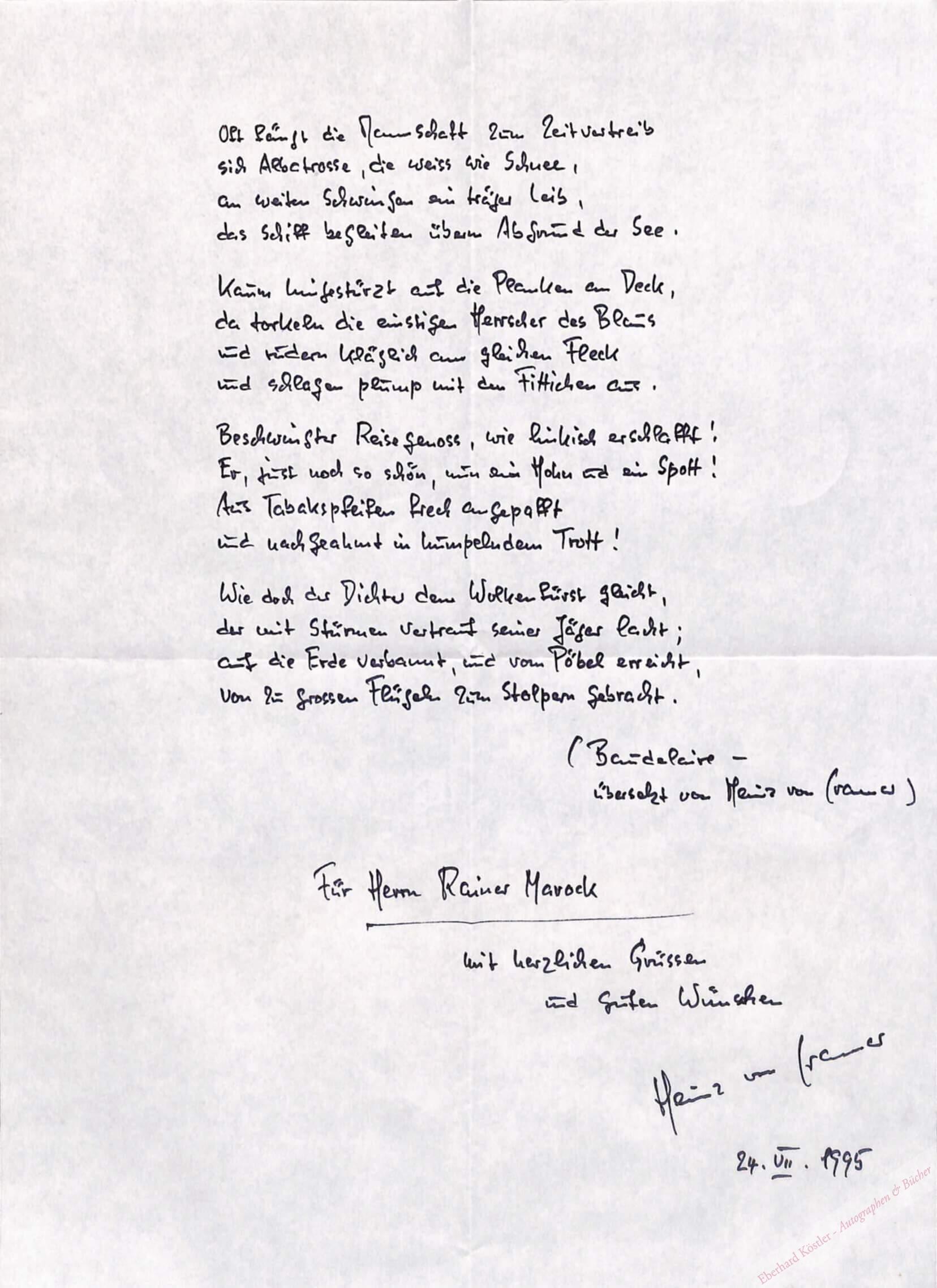 Eine Übersetzung von Baudelaires „L’Albatros“ durch Heinz von Cramer: „Oft fängt die Mannschaft zum Zeitvertreib | sich Albatrosse, die weiss wie Schnee, | an weiten Schwingen ein träger Leib, | das Schiff begleiten überm Abgrund der See. | Kaum hingestürzt auf die Planken an Deck, | da torkeln die einstigen Herrscher des Blaus | und rudern kläglich am gleichen Fleck | und schlagen plump mit den Fittichen aus. | Beschwingter Reisegenoss, wie linkisch erschlafft! | Er, just noch so schön, nun ein Hohn und ein Spott! | Aus Tabakspeifen frech ausgepafft | und nachgeahmt in kumpelndem Trott! | Wie doch der Dichter dem Wolkenfürst gleicht, | der mit Stürmen vertraut seiner Jäger lacht; | auf die Erde verbannt, und vom Pöbel erreicht, | von zu grossen Flügeln zum Stolpern gebracht.“ – Masch. Umschlag beiliegend.