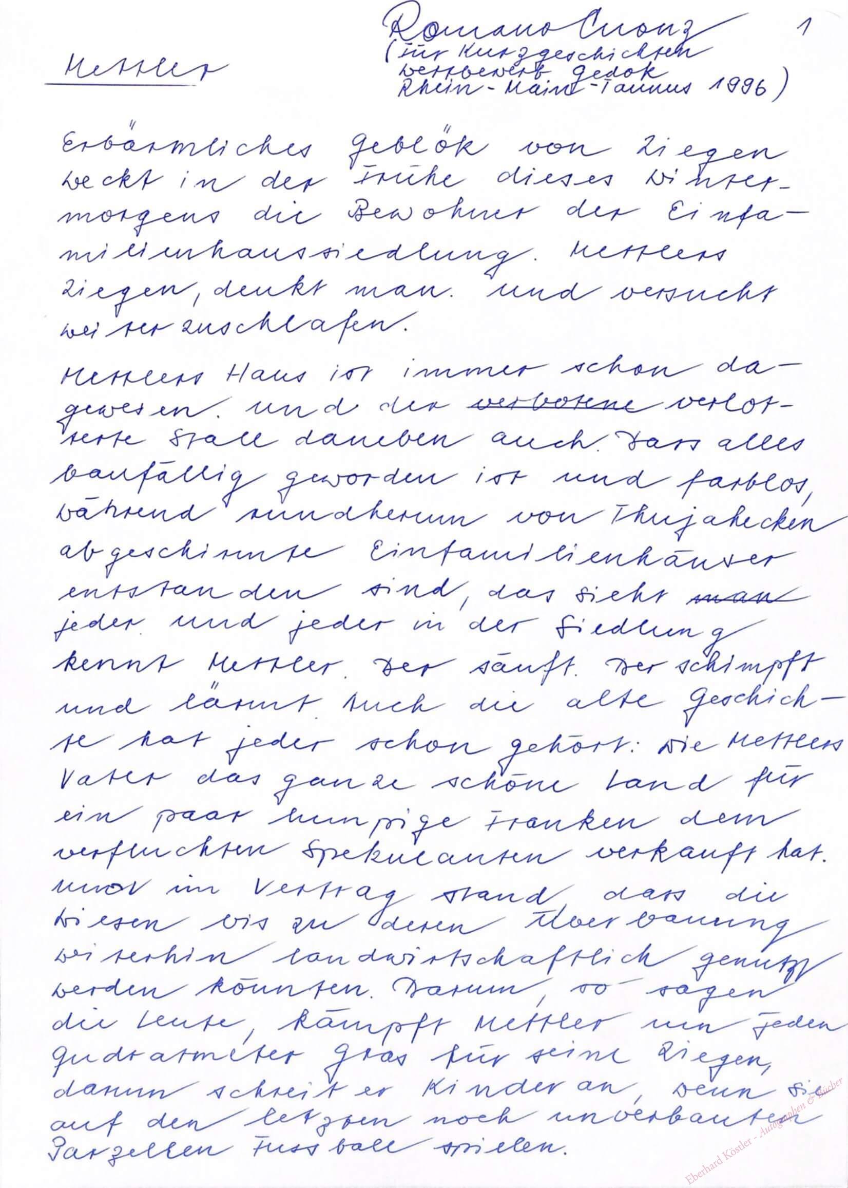 Gedicht „Geile“ und Kurzgeschichte „Mettler“ (jeweils 1 Seite) wurden für den Literatur- bzw. Kurzgeschichtenwettbewerb Gedok Rhein-Main-Taunus 1996 verfasst.