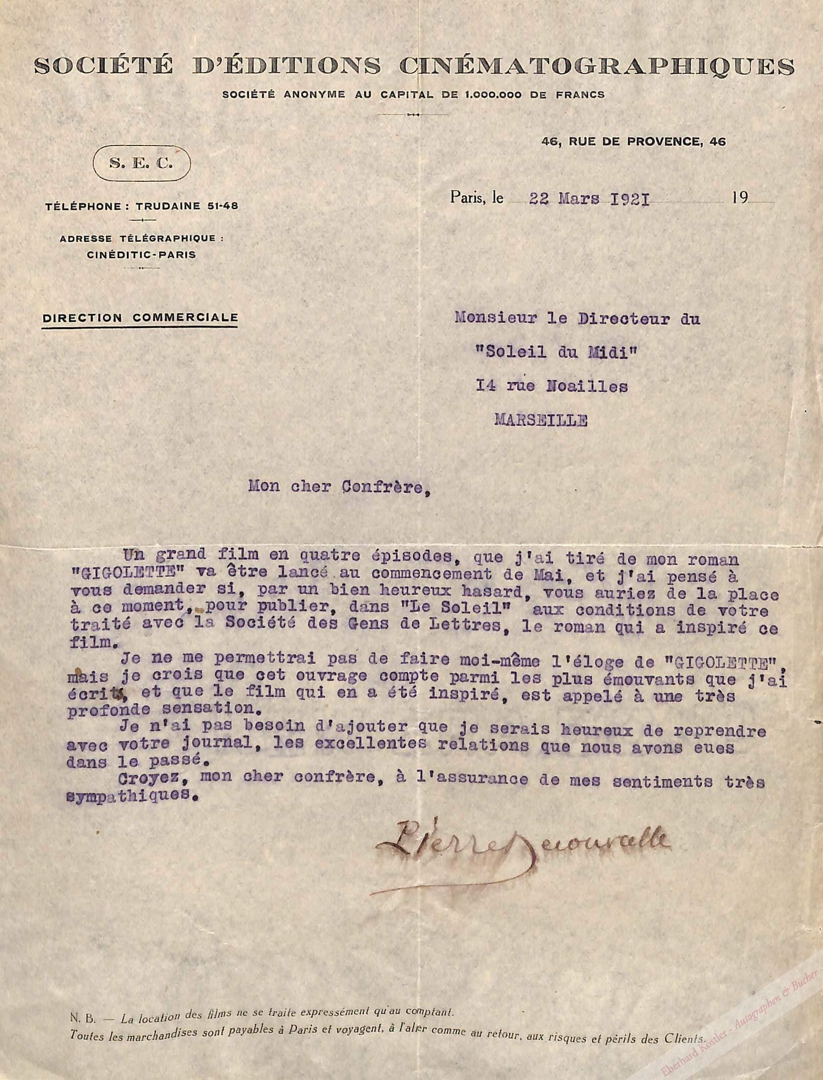 An den Direktor der Zeitung „Soleil du Midi“, den er anlässlich der Verfilmung seines Romans „GIGOLETTE“ um einen Neudruck desselben anfragt.