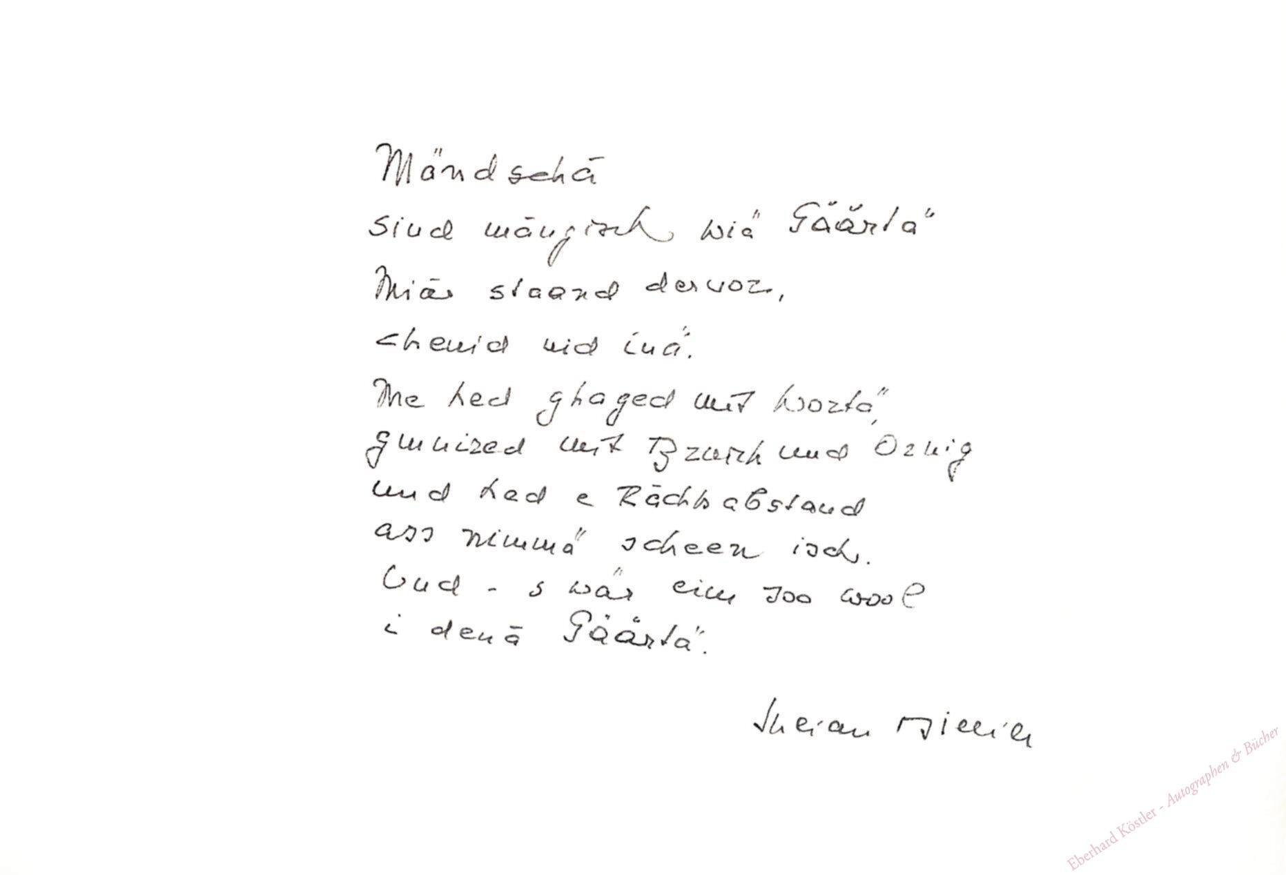 Der Schweizer Mundartautor schickt ein in Mundart verfasstes Gedicht an einen Autographensammler mit der Auskunft, dass er ebenfalls eine eigene Sammlung besitzt: „Uberigens bin auch ich im Besitz einer Autographen-Sammlung, die ich Ihnen gerne zur Verfügung stelle, z. B. zusammen mit einem Autograph von Franz Hohler u. a. Vor einigen Jahren führte ich eine Versteigerung solcher Handschriften durch, ein Unternehmen, das sehr erfolgreich war. Schliesslich bin ich auch noch im Besitz einer grossen Casetten-Sammlung mit etwa 60 Mundart-Autoren…“. – Beiliegend ein masch. Brief (1/2 Seite) mit eigenh. U. „Julian“ an den Verleger Werner Bucher.