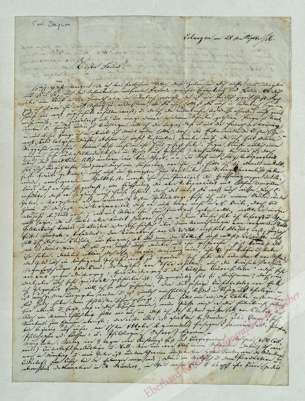 Ausführlicher Brief des Jurastudenten an seinen Freund, den Theologiestudenten J. G.Hacker in Schney bei Lichtenfels, u. a. über Neuigkeiten in der Nachbarschaft und aus dem Bekanntenkreis, über seinen 23. Geburtstag (vorgestern), über besorgte Bücher, über die Universität, das Stiftungsfest des Bürgervereins, Souper, Liedertafel und Ball: „Von uns war blos meine Schwester dabei, ich war noch in Nürnberg u. mein Vater ist aus dem Verein ausgetreten […]“ – Am Schluß „Dein gequälter Gevatter“, mit Postscript: „Viele Grüße von meinem Vater an den deinigen; ebenso von mir; auch an Dich […]“. – Doignon veröffentlichte 1839 seine Gedichtze bei Palm in Erlangen. – Etw. fleckig. – Selten.