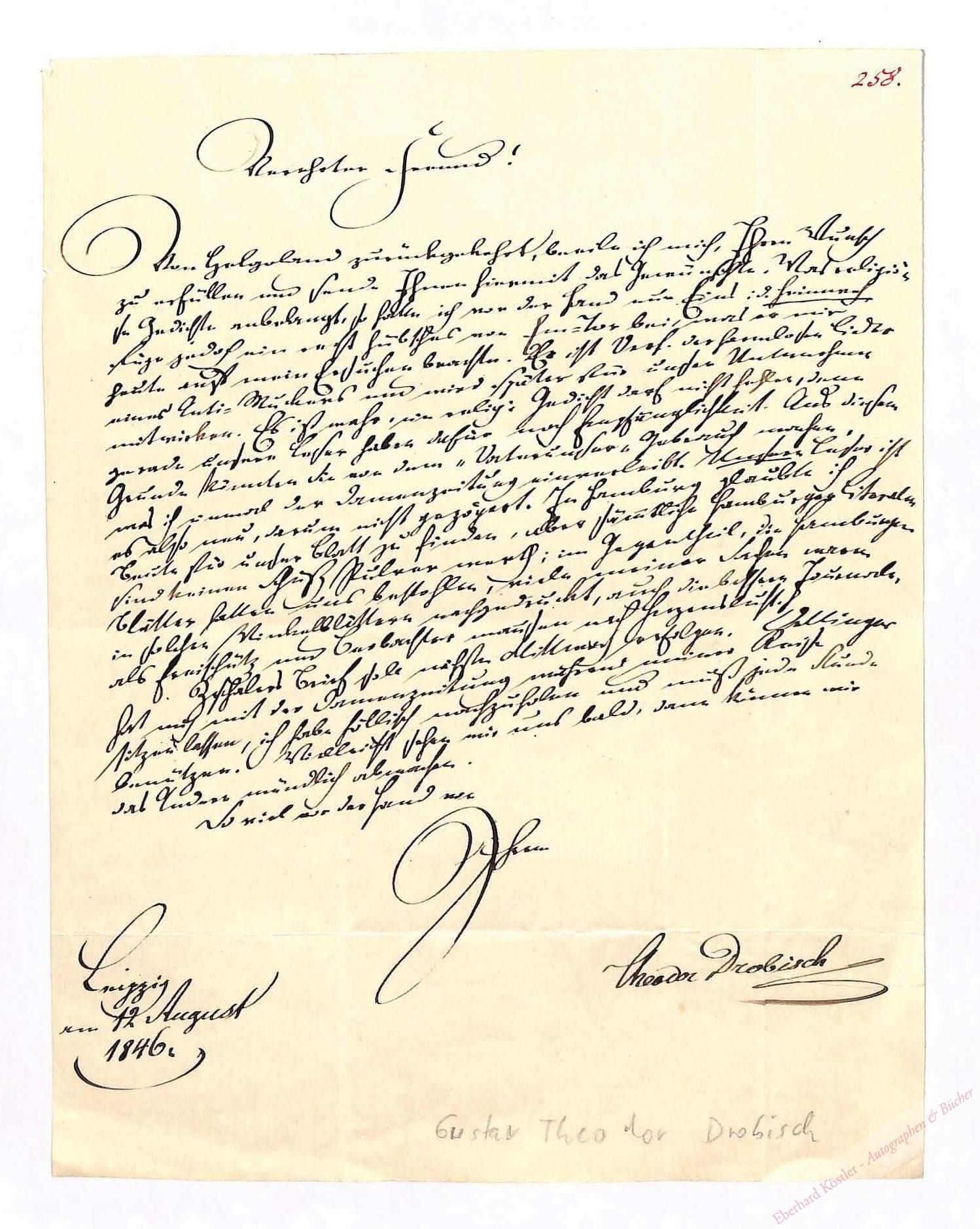 An einen Freund: „[…] Von Helgoland zurückgekehrt […] sende ich Ihnen hiemit […] religiöse Gedichte […] füge jedoch ein recht hübsches von Em-Tor bei […] Er ist Verf[asser] der harmlosen Lieder eines Anti-Muckers […] Oettinger hat mich mit der Damenzeitung während meiner Reise sitzenlassen […]“ – Die Erwähnten sind Eduard Gottlieb Amthor (1820-1884) und sein Buch „Tag und Dämmerung. Harmlose Gedichte […]“ (1846) und Eduard Maria Oettinger (1808-1872).