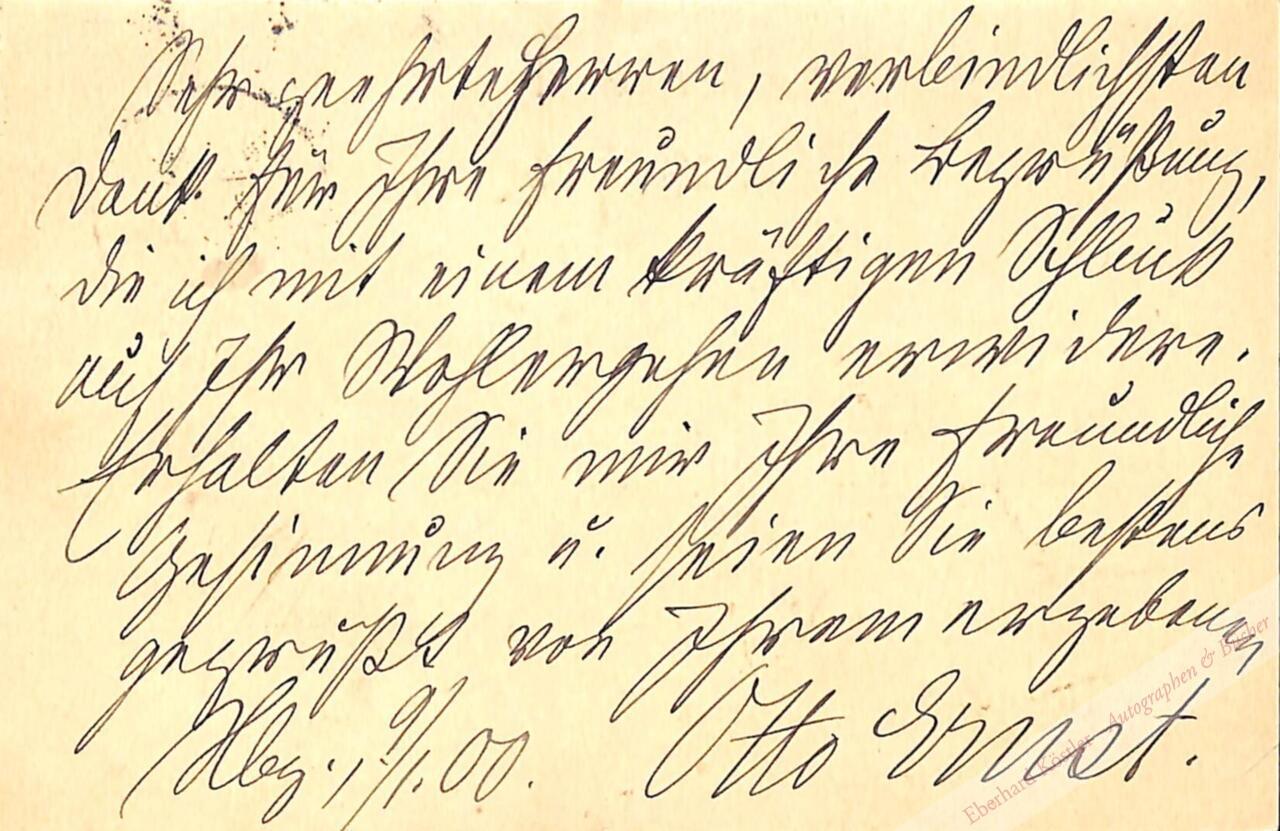 An Otto Anthes und Paul Wittko, Redakteure der Fürstl. Reuss Geraer Zeitung: „Sehr geehrte Herren, verbindlichsten Dank für Ihre freundliche Begrüssung, die ich mit einem kräftigen Schluck auf Ihr Wohlergehen erwidere. Erhalten Sie mir Ihre freundliche Gesinnung u. seien Sie bestens gegrüsst von Ihrem ergebenen Otto Ernst.“ – Mit Beilagen.