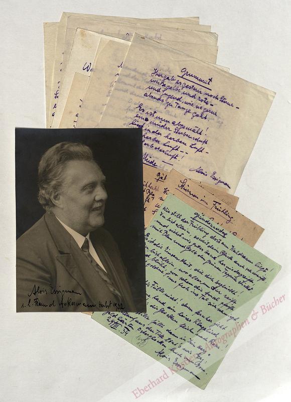 An den Freund Rudolf Ackermann in Wien: Abschriften seiner Gedichte mit Grüßen und Widmungen. Dazu eine schöne Porträtfotografie im Halbprofil aus dem Atelier Josef Rieder in Wien (September 1932). – Essigmann gründete 1919 die Zeitschrift „Das Gewissen“, an der Richard Schaukal mitarbeitete.