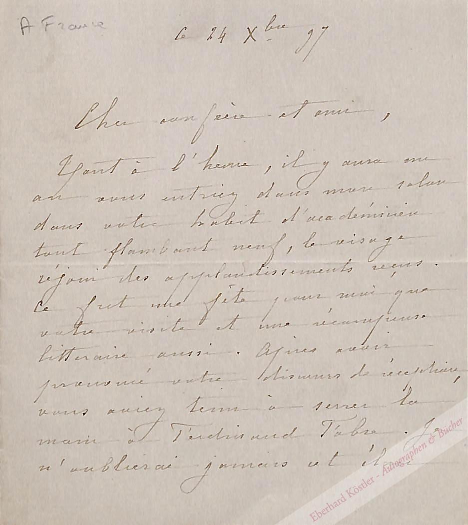 Bedankt sich für einen vorangegangenen Besuch und wünscht alles Gute für das kommende Jahr und eine anstehende Veröffentlichung. „A l’entrée de l’année nouvelle, je vous souhaite tous les bonheurs…“. – Fabre galt als der Balzac der Priesterfiguren.