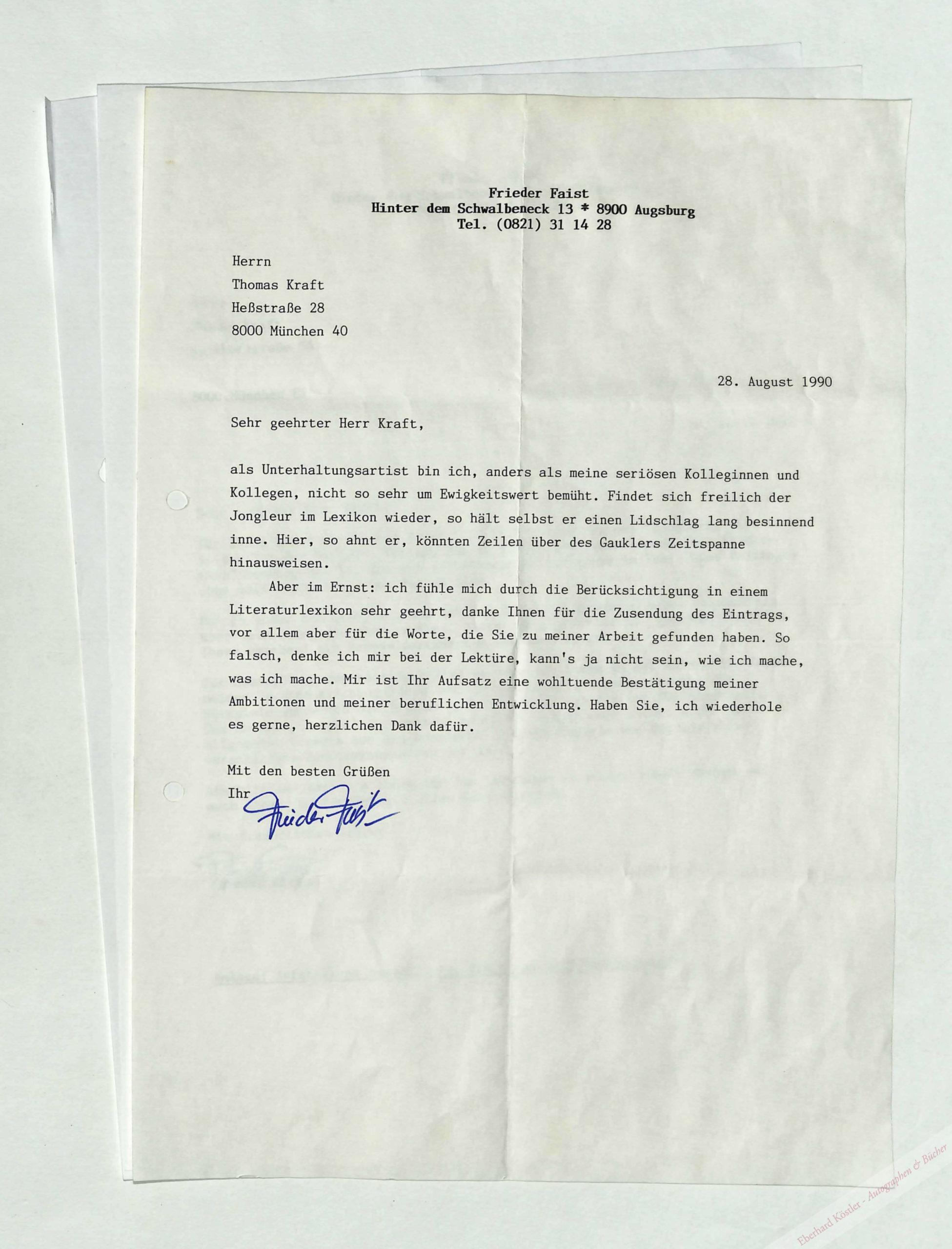 An den Herausgeber eines Literaturlexikons, der Autor kommentiert seinen Lexikoneintrag: „[…] als Unterhaltungsartist bin ich, anders als meine seriösen Kolleginnen und Kollegen nicht so sehr um Ewigkeitswert bemüht. Findet sich freilich der Jongleur im Lexikon wieder, so hält selbst er einen Lidschlag lang besinnend inne. Hier, so ahnt er, könnten Zeilen über des Gauklers Zeitspanne hinausweisen. Aber im Ernst: […] Mir ist Ihr Aufsatz eine wohltuende Bestätigung meiner Ambitionen und meiner beruflichen Entwicklung […]“. – Gelocht.