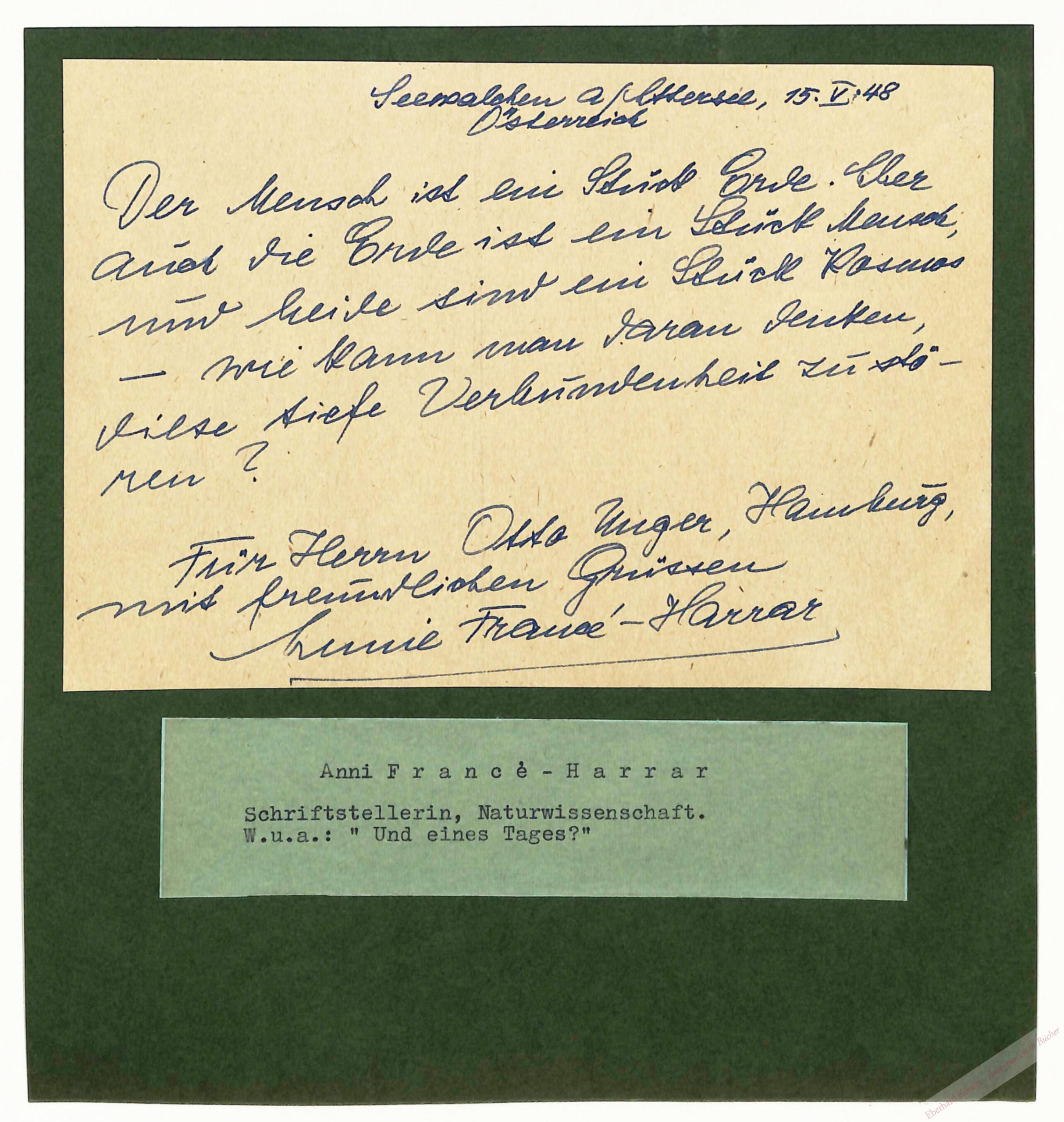 Für Otto Unger in Hamburg: „Der Mensch ist ein Stück Erde. Aber auch die Erde ist ein Stück Mensch und beide sind ein Stück Kosmos […]“ – Eine „Grüne“ avant le mot.