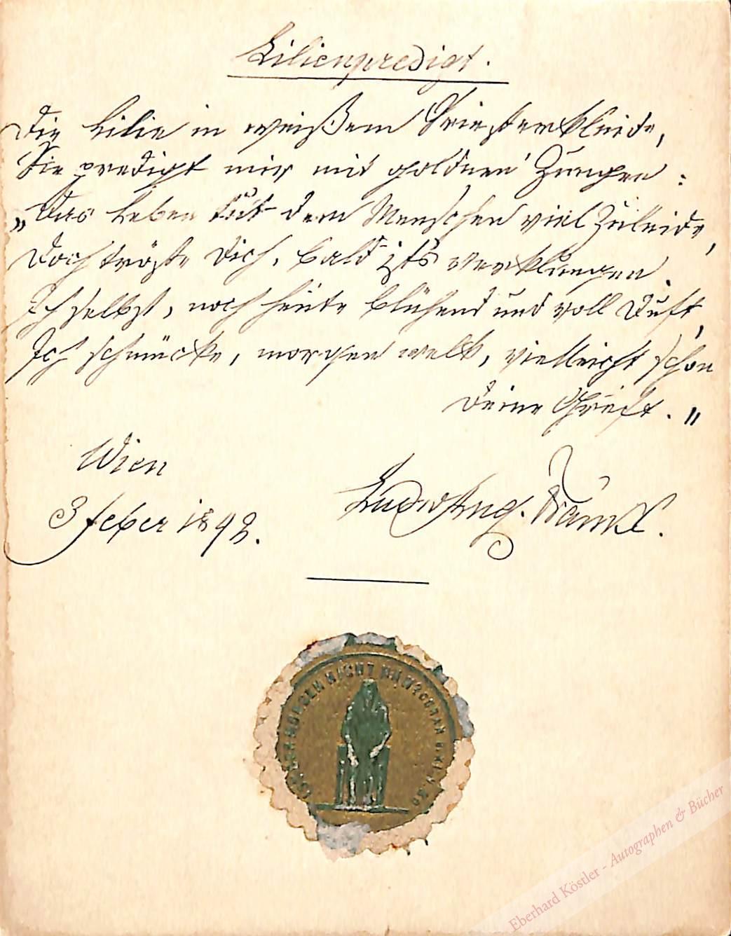 „Lilienpredigt. || Die Lilie im weißen Streifenkleide, | Sie predigt mir mit gold’nen Zungen: | ‚Das Leben tut dem Menschen viel zuleide, | Doch tröste dich, bald ist’s verklungen. | Ich selbst, noch heute blühend und voll Duft, | Ich schmücke, morgen welk, vielleicht schon Deine Gruft‘ […]“