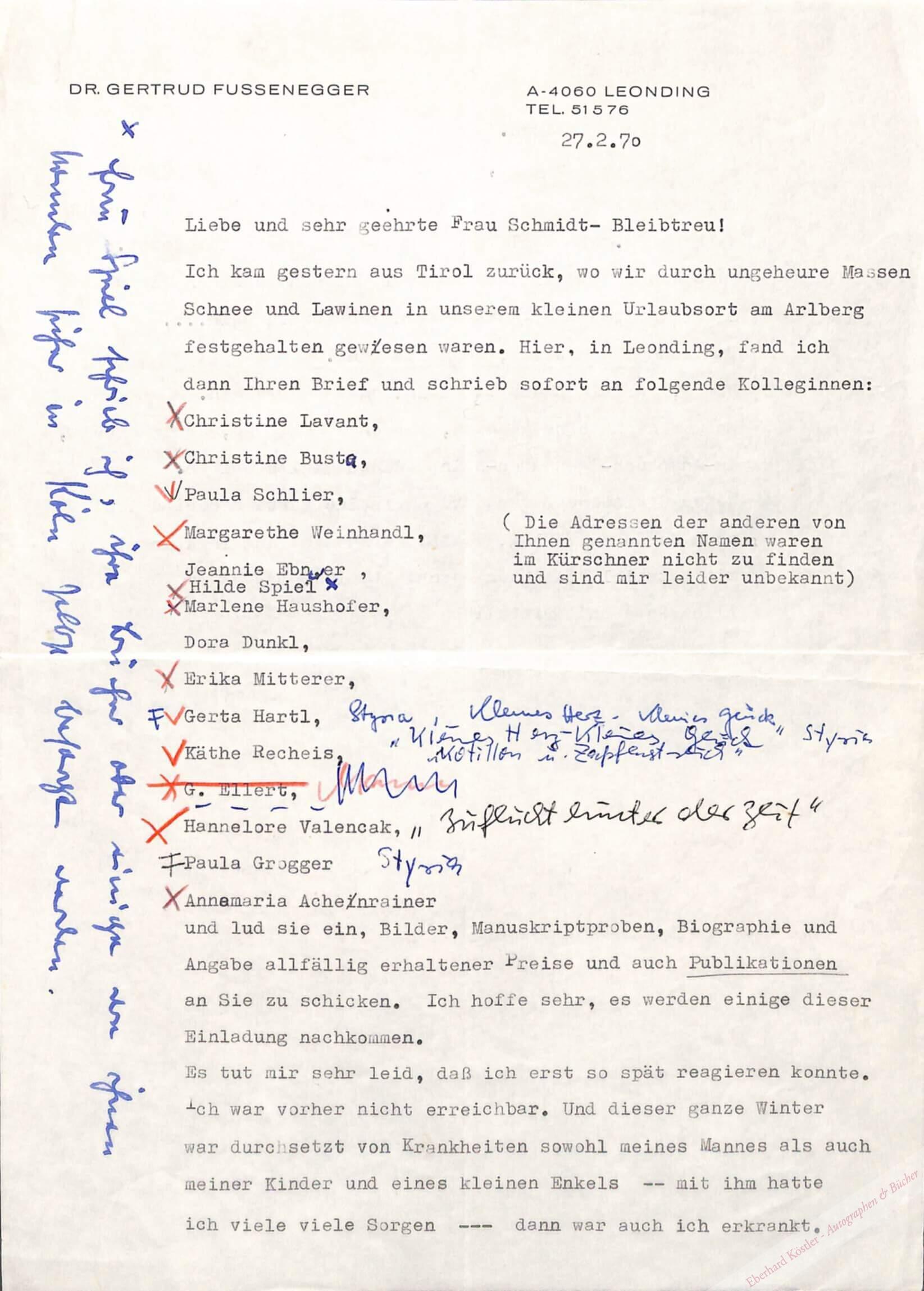 An eine Schriftstellerin: „[…] Besondere Freude waren mir Ihre Nachrichten über Ihre vielfältigen Publikationen und Erfolge. Die Stimme der ‚Hoffnung und des Glaubens‘, die ich aus Ihrem Gedicht vernehmen konnte, möge recht vielen Menschen in dieser verworrenen Zeit Trost zusprechen und zur Zuversicht ermutigen […] Ich habe heuer, d.h. 76 ein Buch über die Donau veröffentlicht, jetzt folgt in wenigen Wochen ein Bändchen Essays, dazwischen erblickte eine Oper das Licht der Welt: ich hatte das Libretto geschrieben […]“ Erwähnt Christine Lavant.