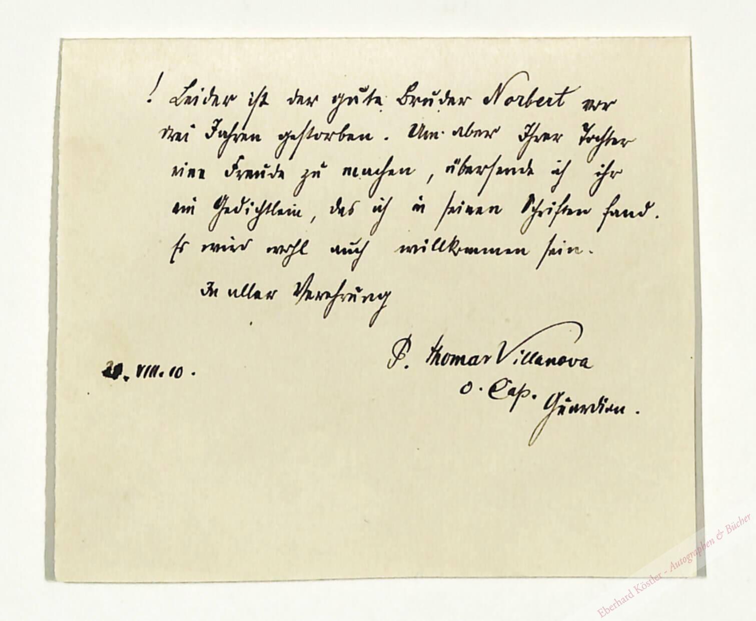 An Prof. Ernst in Prag: „Leider ist der gute Bruder Norbert vor drei Jahren gestorben. Um aber Ihrer Tochter eine Freude zu machen, übersende ich ihr ein Gedichtlein, das ich in seinen Schriften fand. Es wird wohl auch willkommen sein […]“ – Gerster war 1896-1919 Lektor und Domprediger in Brixen, anschließend bis 1940 Prediger und Volksmissionar in Meran.