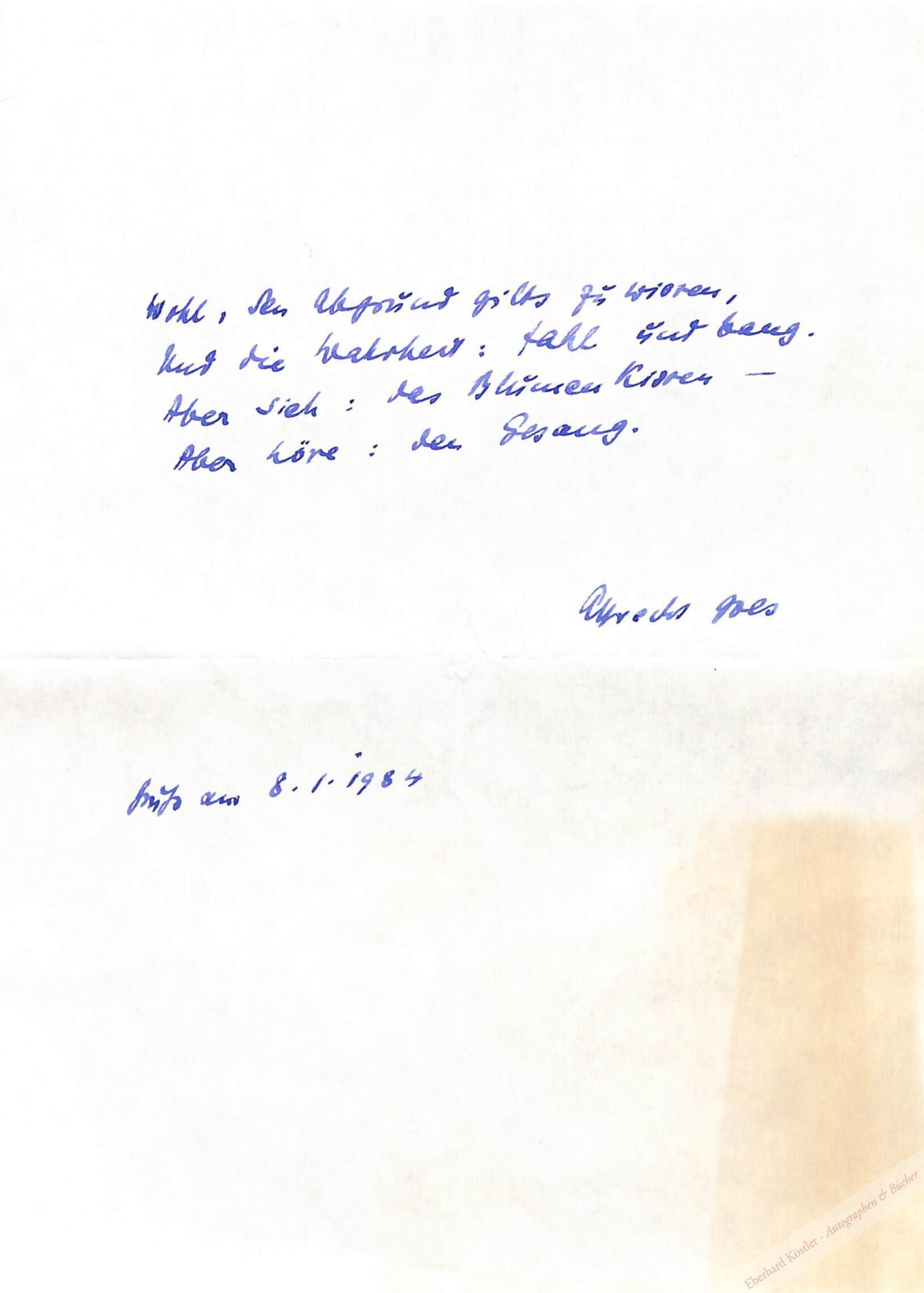 I. „Süssem Leben zugleich und allen bitteren Fiebern, | Himmel und Erde teilhaftig bin ich geboren […]“ – II. „Wohl, den Abgrund gilts zu wissen, | Und die Wahrheit: fahl und bang […]“ – Stellenw. gebräunt.