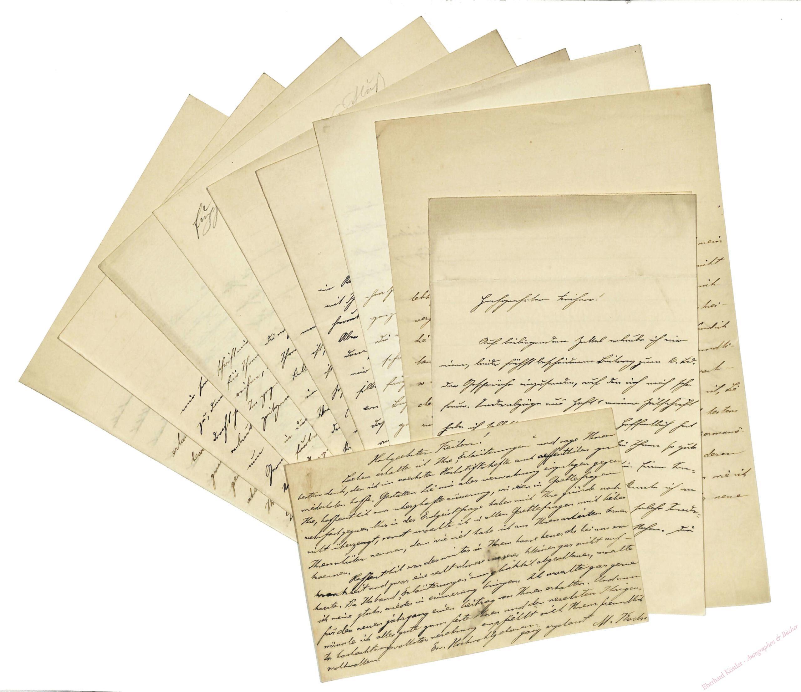 Inhaltsreich an Woldemar bzw. Flodoard von Biedermann. – I. (10. X. 1891): „[…] Ihr Herr Sohn hat den Verlag der Goethestücke meines Schüler Abrich übernommen, vier Bogen sind bereits gedruckt. Ich würde mich sehr freuen, wenn die aus meinem Seminar hervorgegangene Arbeit Ihren Beifall finden würde […] Vom neuen Bande an bin ich alleiniger Herausgeber […] Daß Ihre Zustimmung zu meinen Goetheberichten mir das erfreulichste Lob, das Sie finden können ist, brauche ich nicht erst eigens zu versichern […]“ – II. (6. XII. 1892): Koch wirbt um Mitarbeit an der von ihm herausgegebenen Zeitschrift. – III. (20. II. 1893). – III. (8. IV 1893): „[…] Das Ergebnis meiner Nachforschungen über Hagemann ist nur das Negative […] In einem Stammbuch der Stadtbibliothek hat sich H. 1796 in Mainz eingezeichnet. Hab ich Ihnen schon mitgeteilt, daß Archivdirektor Grünhagen die im Gespräch Nr. 92 mitgeteilten Nachrichten über Goethes Zusammentreffen mit Hermes als erfunden nachgewiesen hat? […]“ – IV. (22. XII. 1893): „[…] Gestatten Sie mir aber Verwahrung einzulegen gegen Ihre, hoffentlich nur scherzhafte Äusserung […] Nur in der Erdgeistfrage haben mich Ihre Gründe noch nicht überzeugt […]“ – V. (10. V. 1894): „[…] Ich bin bei jener Berlinerclique, welche die Goethegesellschaft beherrscht, im großen Bann. Im Jahresbericht f. Lit. Gesch. ist meine Goethebibliographie in Goedekes Grundriß totgeschwiegen, im Jahrbuch meine Schillerbibiographie […] Dafür hat Geiger in den Jahresberichten […] meine ‚recht bedenklichen Zusätze‘ zu Goedekes Goethebiographie getadelt und als einziges Beispiel einen Satz angeführt, der wirklich in der ersten Auflage des Grundrisses […] zu lesen ist […]“ – VI. (12. XI. 1894): „[…] Hoffentlich hat mein letzter Goethe-Schillerbericht in den Hochstiftsheften Ihren Beifall gefunden. In der Frankfurter Zeitung bin ich […] in recht pöbelhafter Weise deshalb angegriffen worden […]“ – VII. (16. I. 1895): „[…] Hoffentlich hat meine bescheidene Fausthypothese bei Ihnen so gut Aufnahme gefunden wie bei Valentin […]“ – VIII. (7. IV. 1899): „[…] Mit dem aufrichtig wärmsten Danke erlaube ich mir zugleich meinen Glückwunsch zu der nun abgeschlossenen Trilogie der ‚Goetheforschung‘. Über die skandalöse Behandlung des Straßburger Goethedenkmals im Reichstag werden gerade Sie […] als einer der Führer der alten Goethegarde bittern Unmut empfunden haben […]“ – IX. (3. VI. 1891): „[…] Sie sind aber an Goethekenntnissen so unendlich reich, daß schon Ihre leicht hingeworfenen Brosamen andere speisen […]“